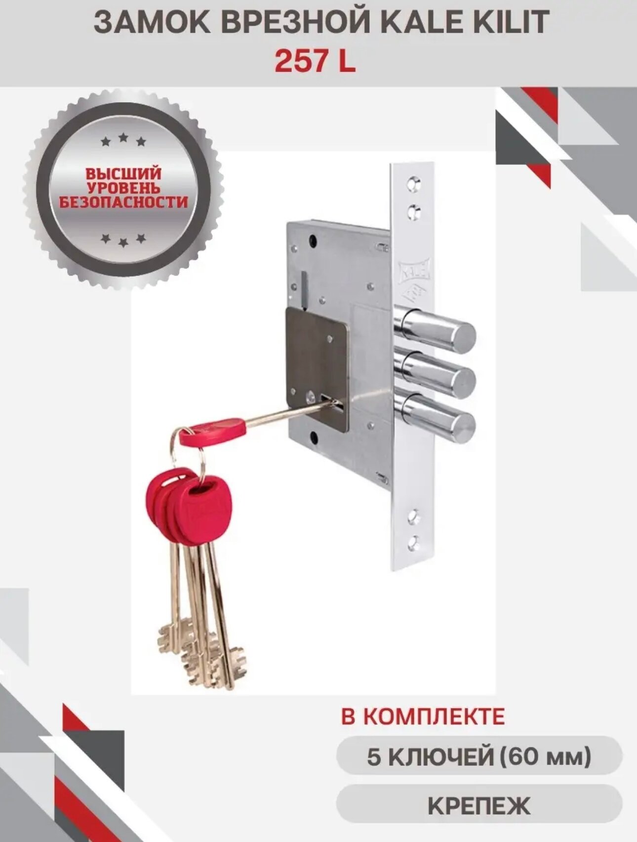 Замок Kale kilit (Кале килит) врезной сувальдный 257 L CR, 5K-128 (тех. упаковка),планка 35мм, 5 ключей