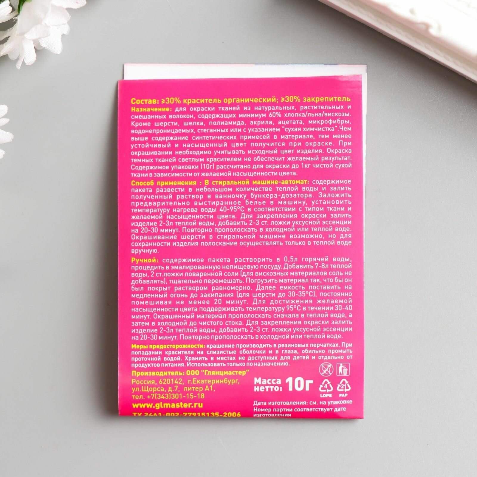 | Дополнительная информация | содержимое упаковки (10г) рассчитано для окраски до 1кг чистой сухой ткани в зависимости от желаемой насыщенности цвета |