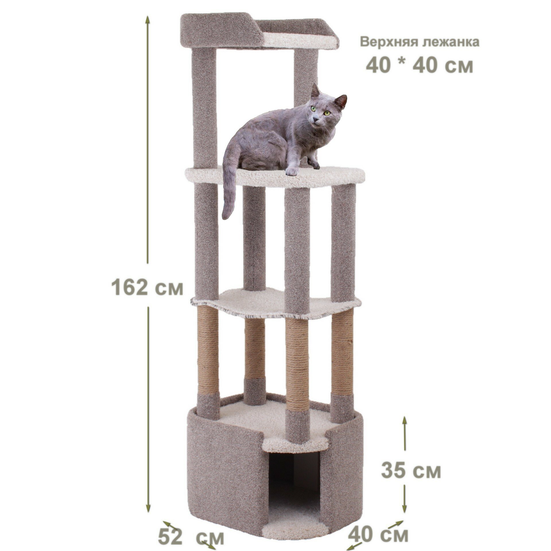 Когтеточка для кошек с домиком, гамаком и лежанками "Етк Зоо" Kiss 162, 40*52*162, бежевый ковролин, джут