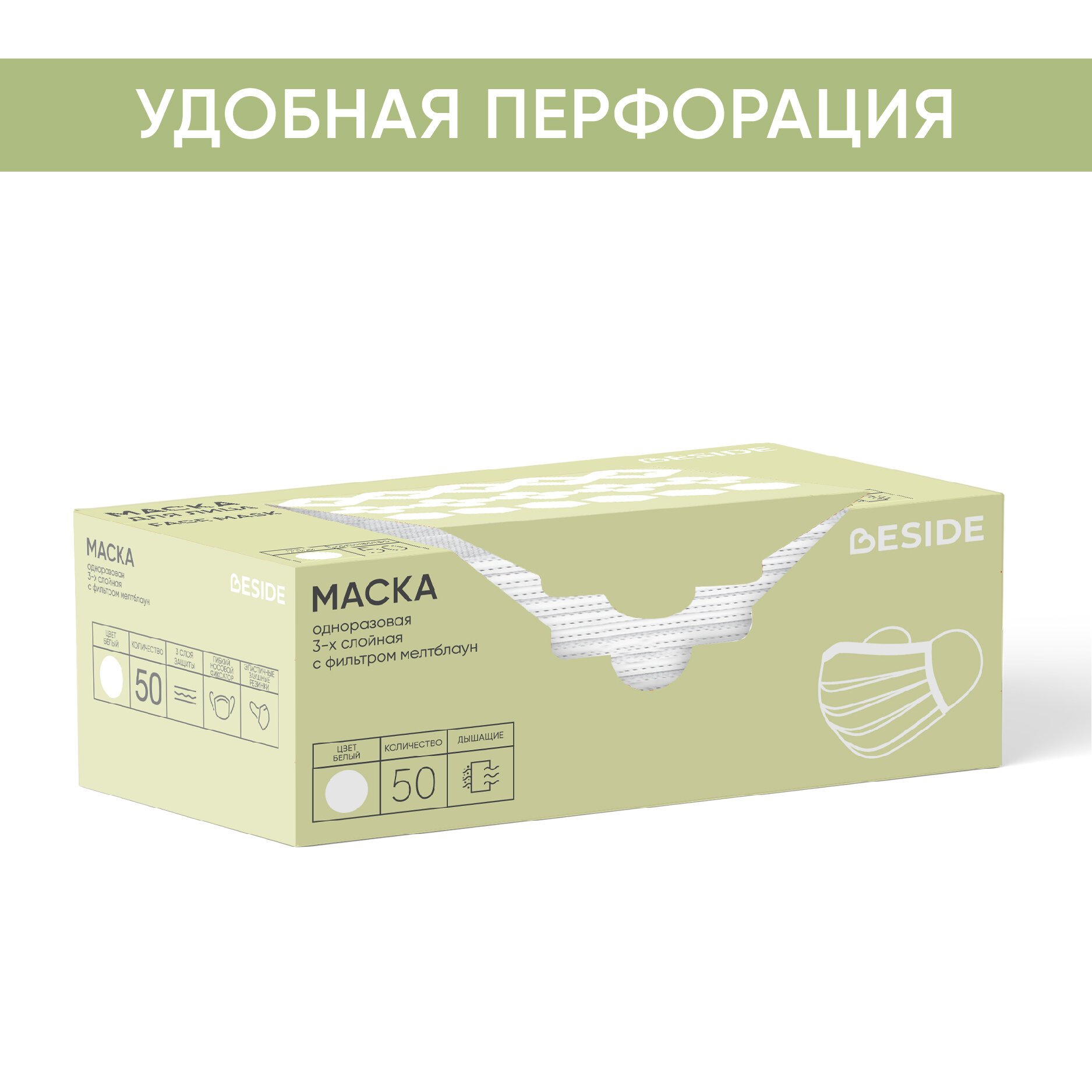 Купить Маски медицинские одноразовые для лица BESIDE, 50 шт, белые трехслойные, мелтблаун, для взрослых и детей, набор гигиенических защитных масок