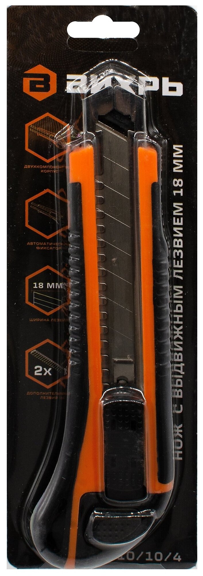 Купить Нож Вихрь с выдвижным лезвием 18 мм, двухкомпонентный корпус, автоматический фиксатор, 73/10/10/4