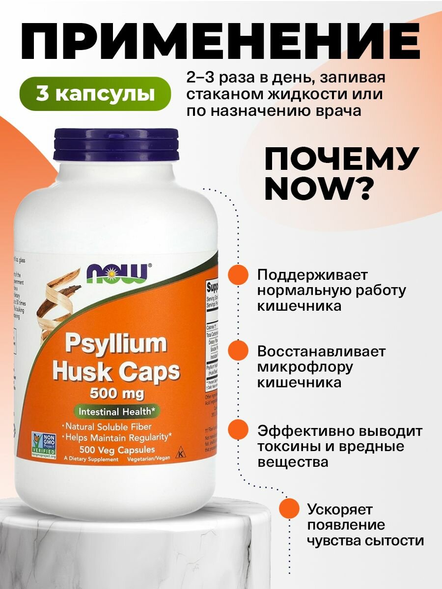 Купить NOW Psyllium Husk, Шелуха семян подорожника 500 мг 500 растительных капсул, Антиоксидант для пищеварения, выведение токсинов, для похудения