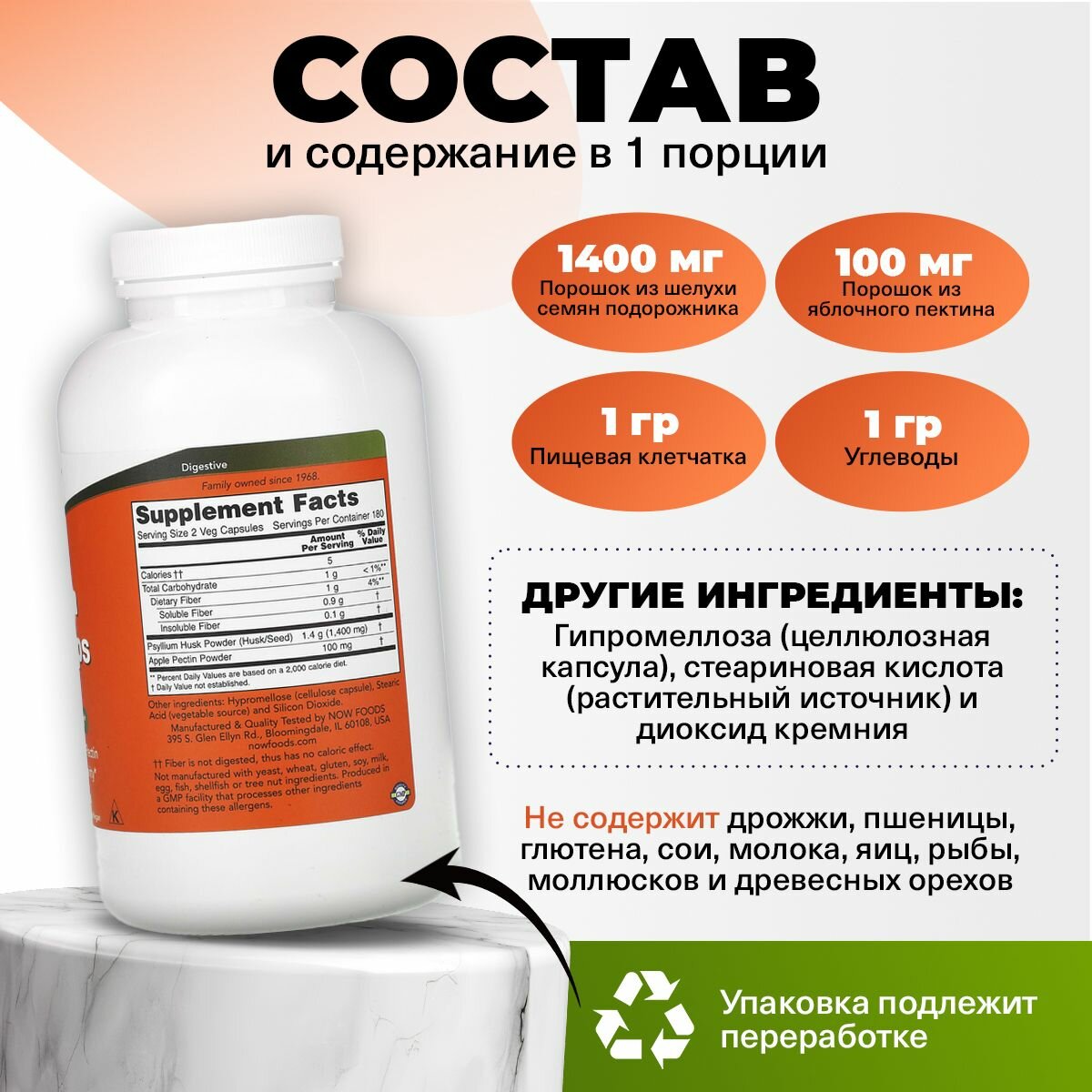 | Состав | Всего углеводов 1 г,Пищевая клетчатка 1 г,Растворимые волокна 0,9 г,Калории 5,Нерастворимая клетчатка 0,1 г,Порошок шелухи подорожника (шелуха/семена) 1,4 г (1400 мг),Яблочный пектиновый порошок 100 мг |
