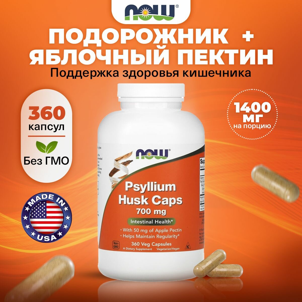 NOW Psyllium Husk Caps, Подорожник 700 мг + Яблочный Пектин - 360 капсул