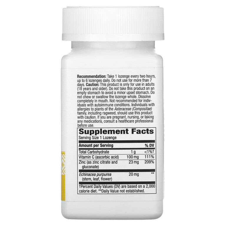 | Состав | витамин С (аскорбиновая кислота), цинк (цитрат и глюконат цинка), эхинацея пурпурная (Echinacea purpurea) (стебель, лист, цветок); сорбитол, фруктоза, маннит, натуральный ароматизатор, бикарбонат натрия, стеарат магния, натуральный ароматизатор «Французская ваниль», экстракт листьев стевии |