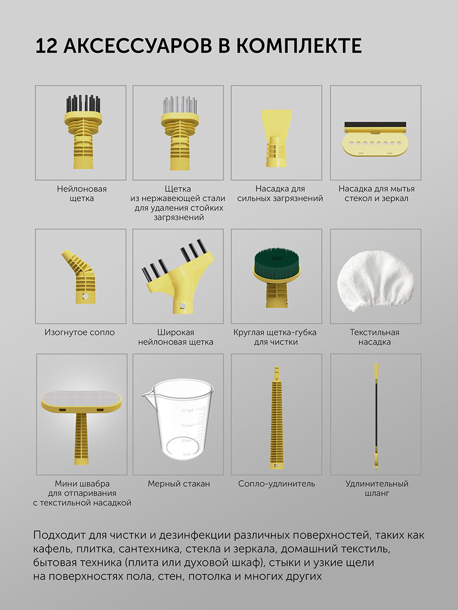| В комплекте | насадка для пола, насадка-губка, насадка-скребок, насадка-щетка, роторная насадка, точечная насадка |