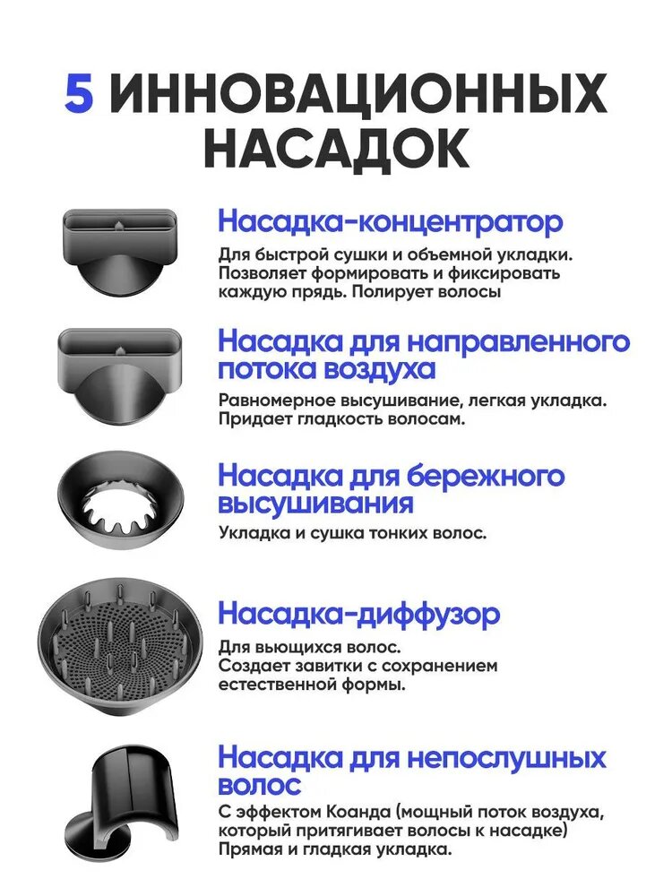 | Подробная комплектация | одна насадка и фен |