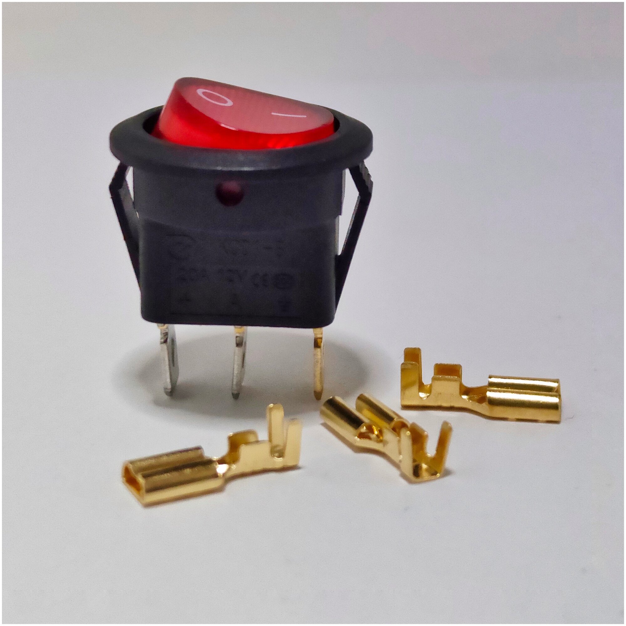 Выключатель клавишный круглый 12V 20А (3с) ON-OFF красный с подсветкой (комплект с клеммами и термоусадкой)