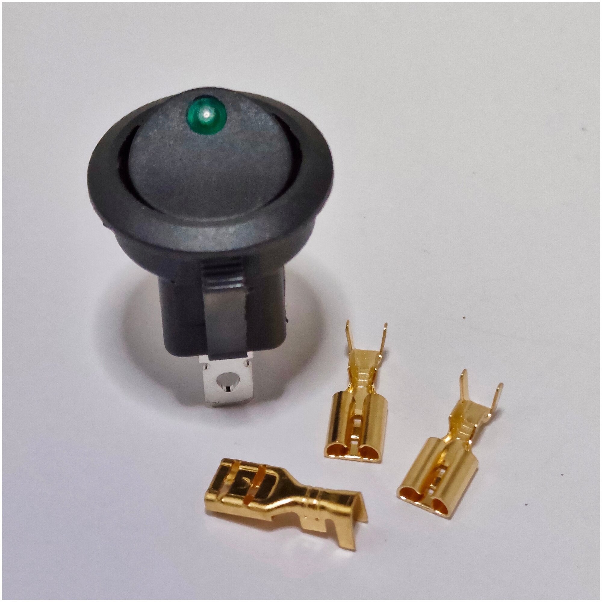 Выключатель клавишный круглый 12V 20А (3с) ON-OFF черный с зеленой подсветкой (комплект с клеммами и термоусадкой)