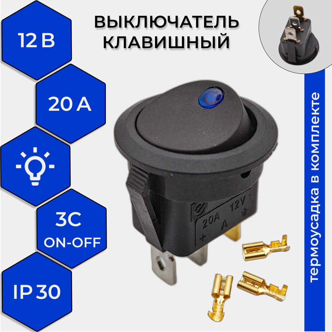 Выключатель клавишный круглый 12V 20А (3с) ON-OFF черный с синей подсветкой (комплект с клеммами и термоусадкой)
