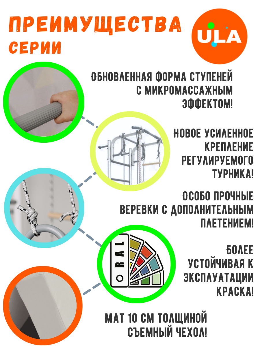 | Комплектация | веревочная лестница / гимнастические кольца / канат / мат |