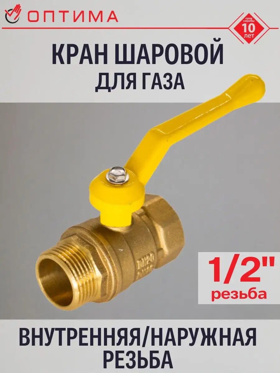 Купить Кран шаровый для газа оптима ГАЗ 1/2" гайка-штуцер рычаг латунь