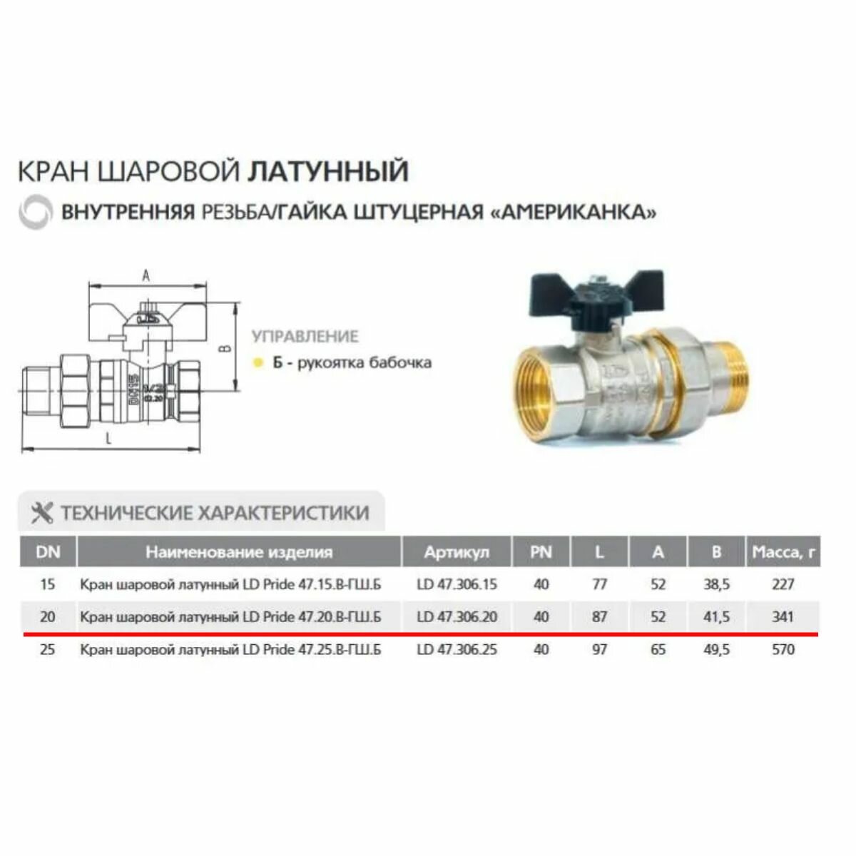 LD Pride Кран шаровой латунный 47.20.В-ГШ.Б, вн.резьба/"американка", ручка-бабочка, 3/4" LD 47.306.20