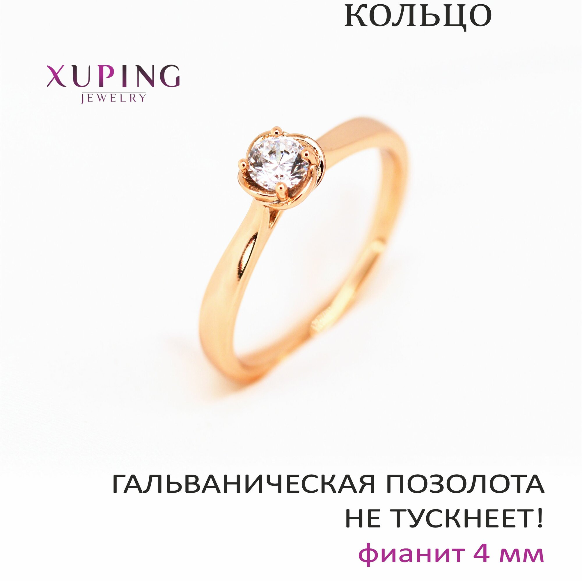 Кольцо с фианитом 6 мм, XUPING JEWELRY, гальваническая позолота 18К