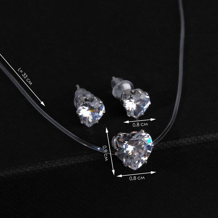 Гарнитур 2 предмета: серьги, кулон "На леске" сердечко, цвет белый в серебре, 30см