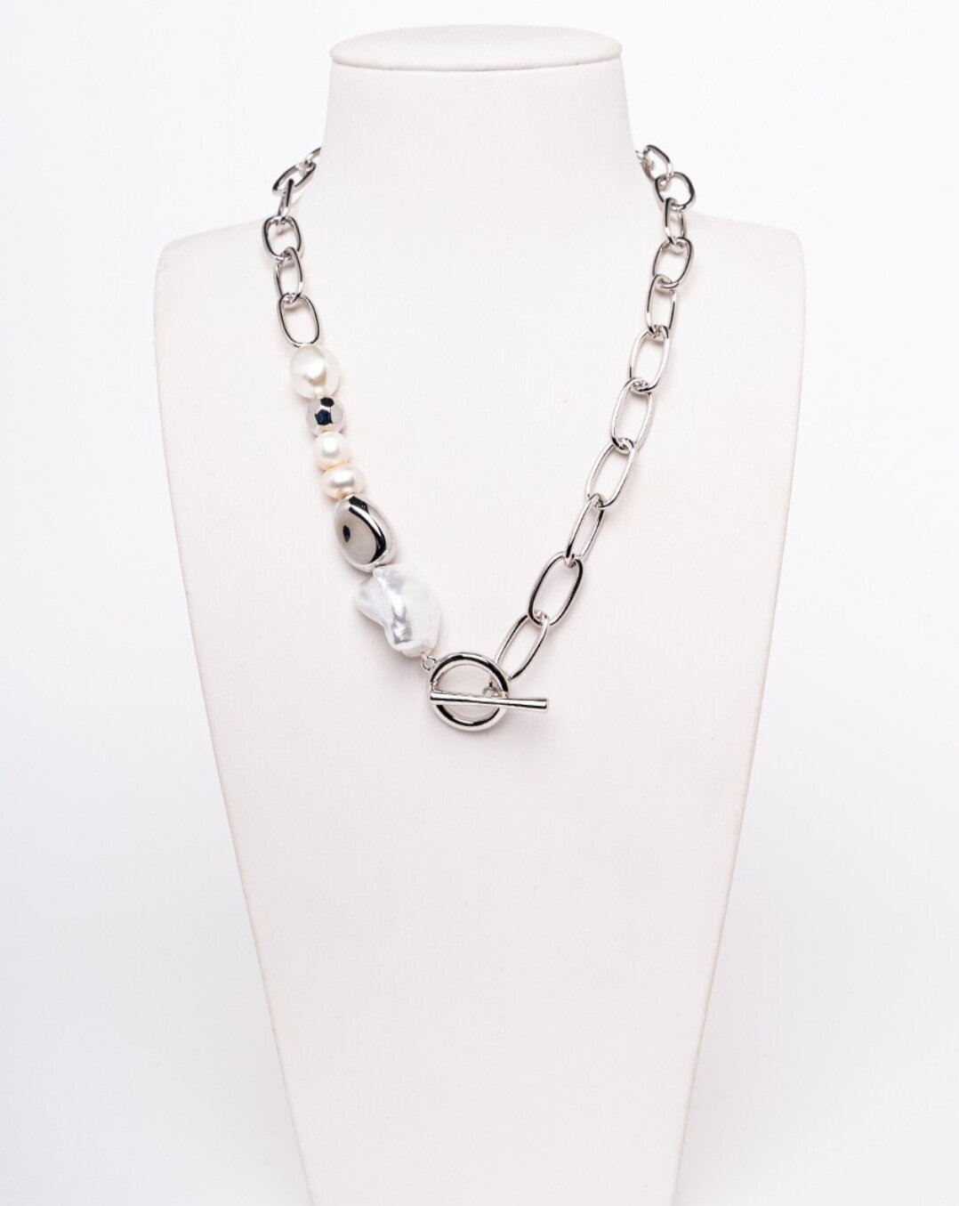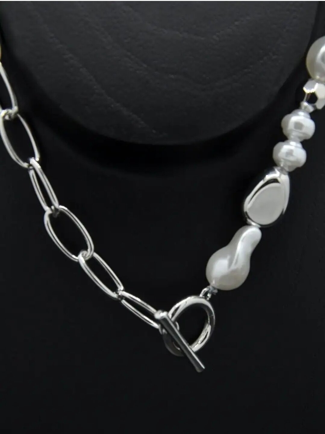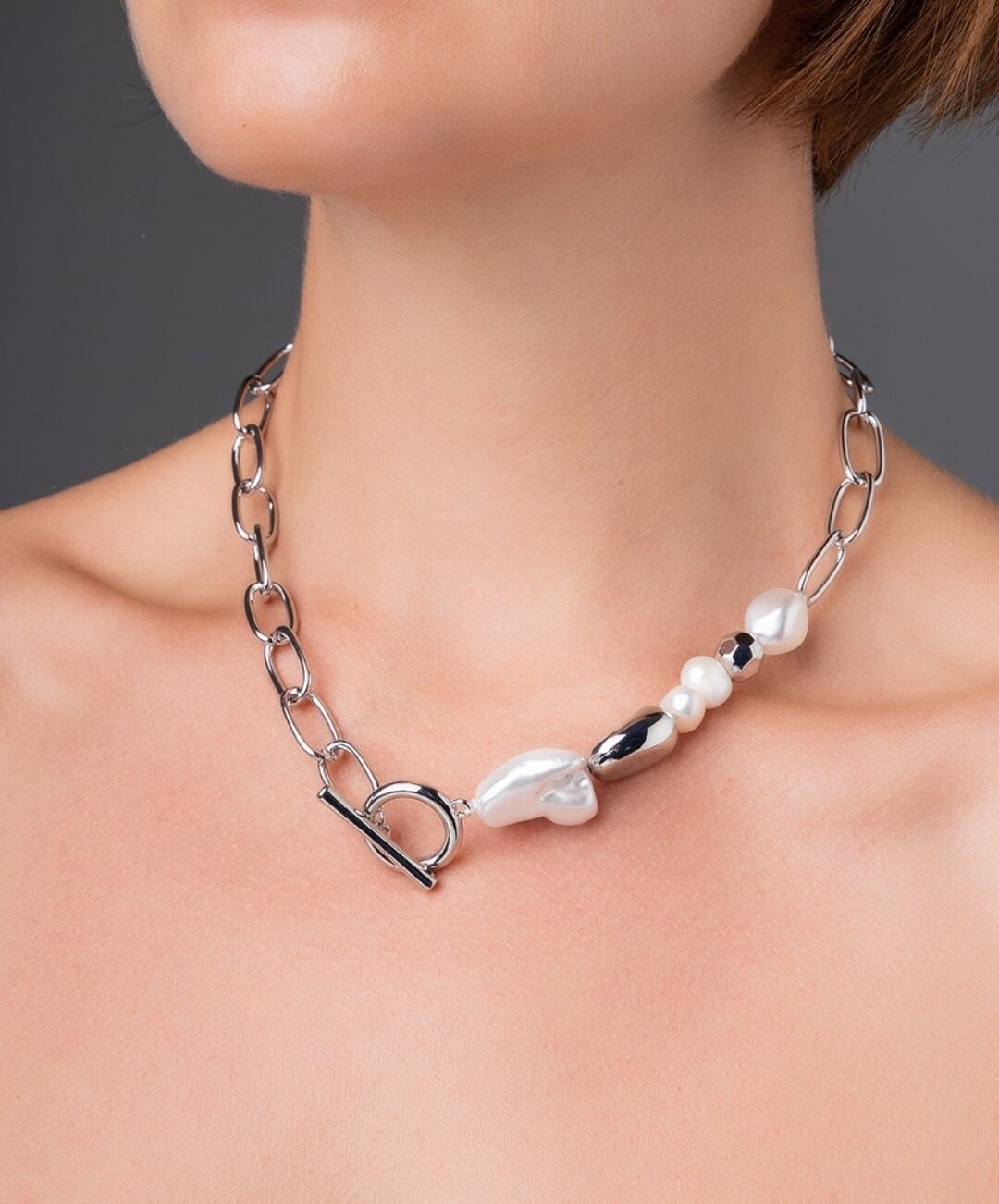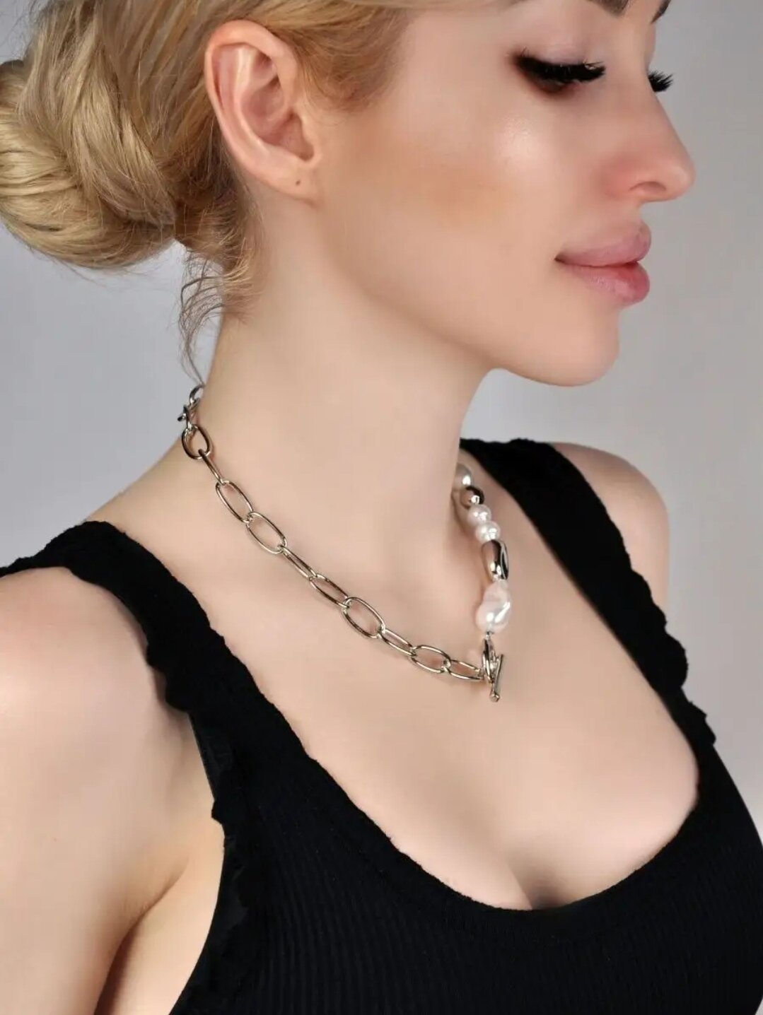 Цепочка на шею с искуственным жемчугом, серебряная, женская, на карабине, унисекс украшение бижутерия