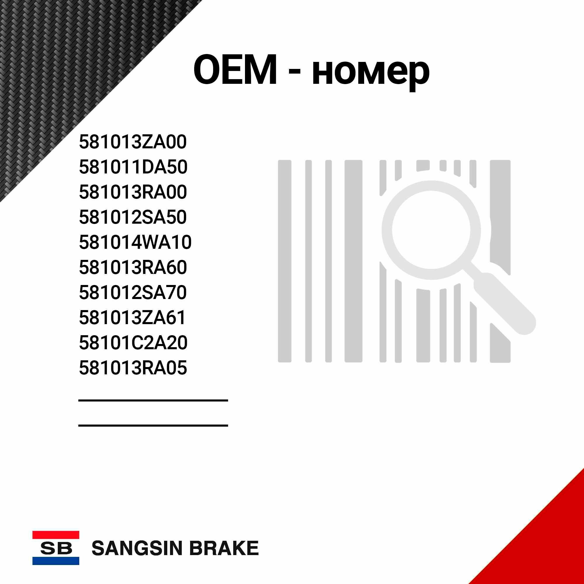 | Соответствующие коды OE | HYUNDAI / KIA 58101-0ZA00 HYUNDAI / KIA 58101-1DA00 HYUNDAI / KIA 58101-1DE00 HYUNDAI / KIA 58101-2SA51 HYUNDAI / KIA 58101-2SA70 HYUNDAI / KIA 58101-2YA00 HYUNDAI / KIA 58101-2YA50 HYUNDAI / KIA 58101-3ZA10 HYUNDAI / KIA 58101-3ZA70 HYUNDAI / KIA 58101-3ZA76 |