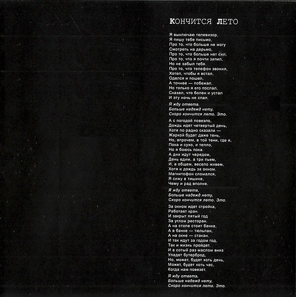 | Треклист | 1. Кончится лето 2. Красно-желтые дни 3. Нам с тобой 4. Звезда 5. Кукушка 6. Когда твоя девушка больна 7. Муравейник 8. Следи за собой |