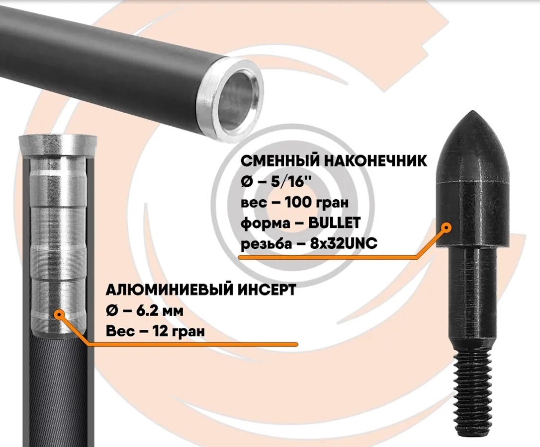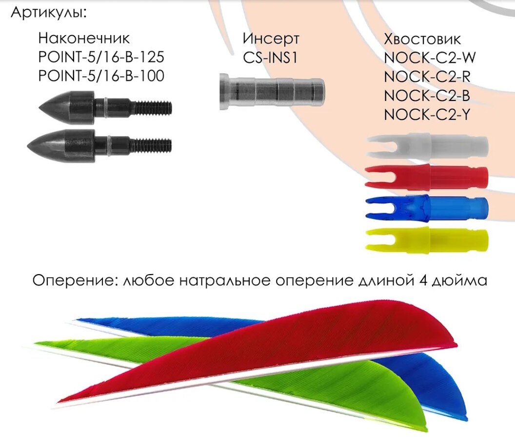 | Подробная комплектация | Стрелы оклеены натуральным оперением и комплектуются наконечником и хвостовиком |