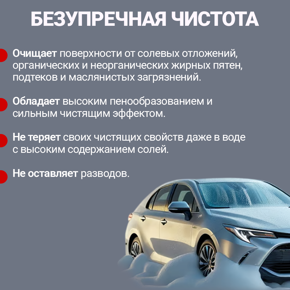 | Способ применения | Средство необходимо разбавить с водой из расчета: Пенокомплект: 80-110 г из расчета разбавления водой 1:8-12, в зависимости от степени загрязнения Пеногенератор: (25, 50, 100л) концентрат разводят в соотношении 8-15 г/л из расчета разбавления водой 1:90-150, в зависимости от степени загрязнения Система дозирования (ДОЗАТРОН) выставляется показатель концентрации 1,5-3%. Сбить с поверхности рыхлый слой грязи и нанести разбавленный состав снизу вверх для избежания подтеков. Выдержать 1-2 минуты, не допуская высыхания. Смыть водой под высоким давлением. Средний расход на одну легковую машину составляет 40-50 г. Допускается увеличение концентрации средства для очистки сверх загрязненных поверхностей. |