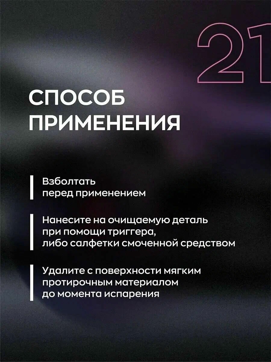 | Способ применения | Нанесите на очищаемую деталь при помощи триггера либо салфетки смоченной средством, удалите с поверхности мягким протирочным материалом до момента испарения. Рекомендации: не наносить на горячую поверхность, под воздействием прямых солнечных лучей, при отрицательной температуре. |