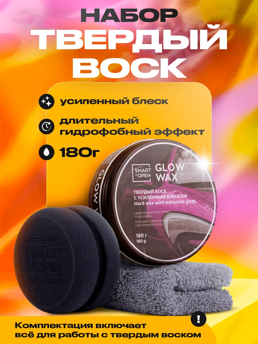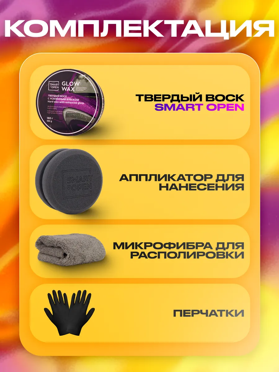 Набор твердый воск для авто Smart Open "Glow Wax"+ аппликатор, микрофибра, перчатки, гидрофоб, с усиленным блеском, 180г интересное:
