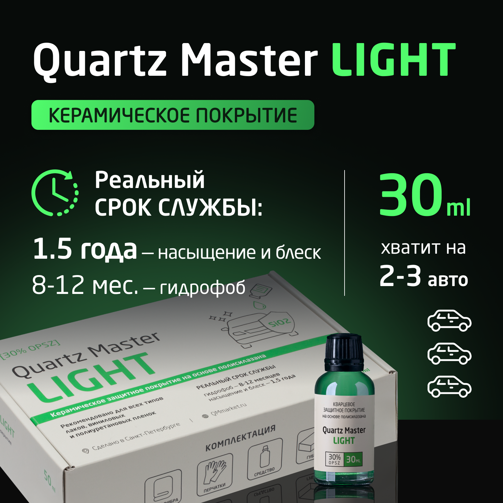 Купить Кварцевое Керамическое Гидрофобное Защитное покрытие для кузова автомобиля Жидкое стекло Керамика Quartz Master Light