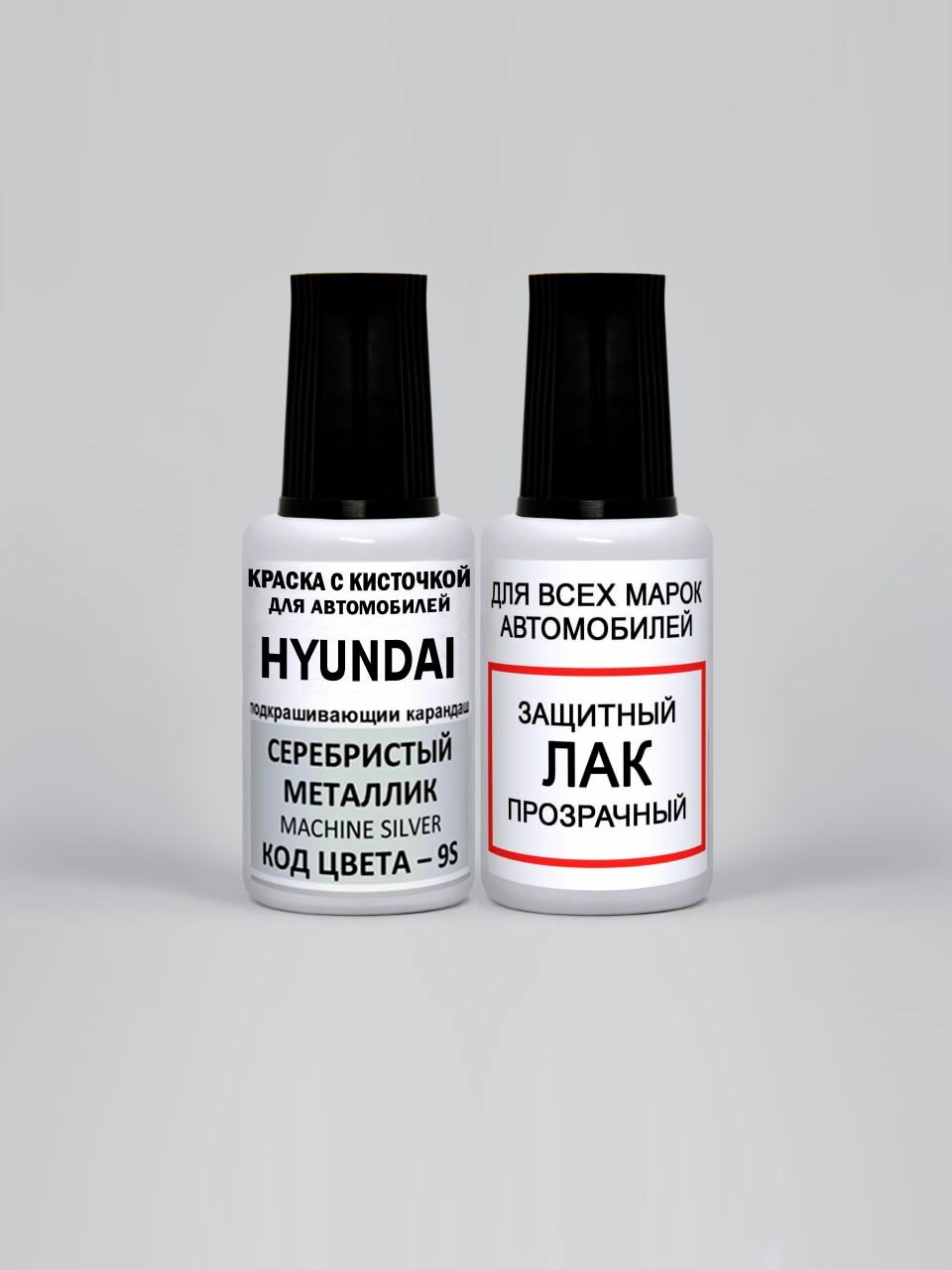 Краска для сколов во флаконе с кисточкой 9W Hyundai Серебристый металлик, Metallic Sand 20 мл. , краска+лак 2 предмета