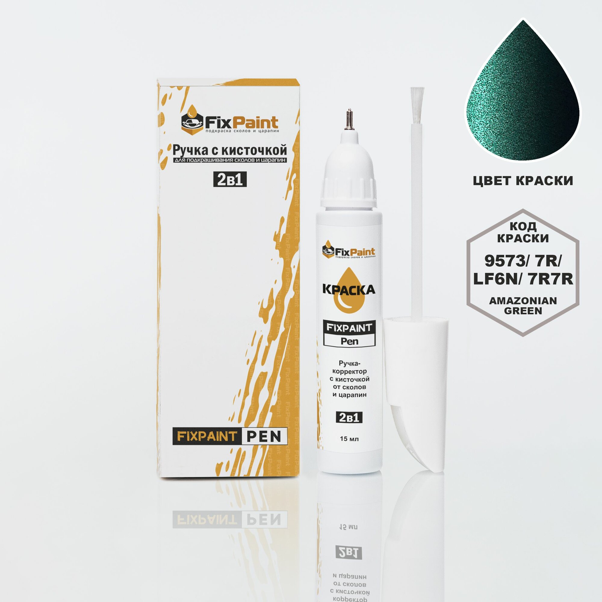 Подкраска SKODA, код 9573, 7R, LF6N, 7R7R, AMAZONIAN GREEN, ручка-корректор с кисточкой 2 в 1 FixPaint Pen 15 мл, эмаль для ремонта сколов и царапин