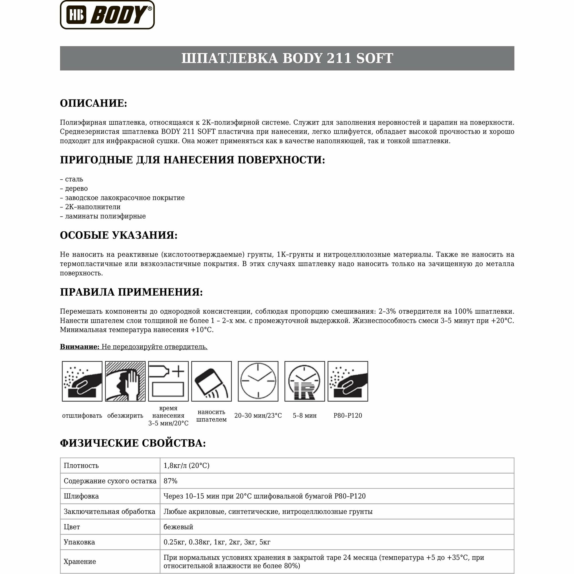 Шпаклевка, Шпатлевка, универсальная для кузова автомобиля HB BODY 211 BODYSOFT 5 кг / 2К полиэфирная мультизернистая шпатлевка с отвердителем в комплекте