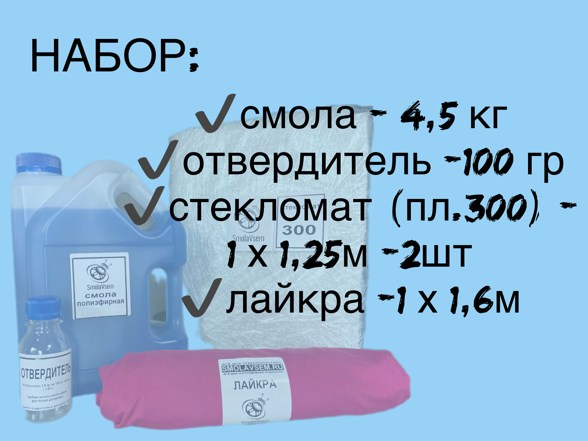 | Дополнительная информация | Смола полиэфирная -4500гр, лайкра 100*160 , стекломат 300 - 100*125-2шт, отвердитель 100гр |