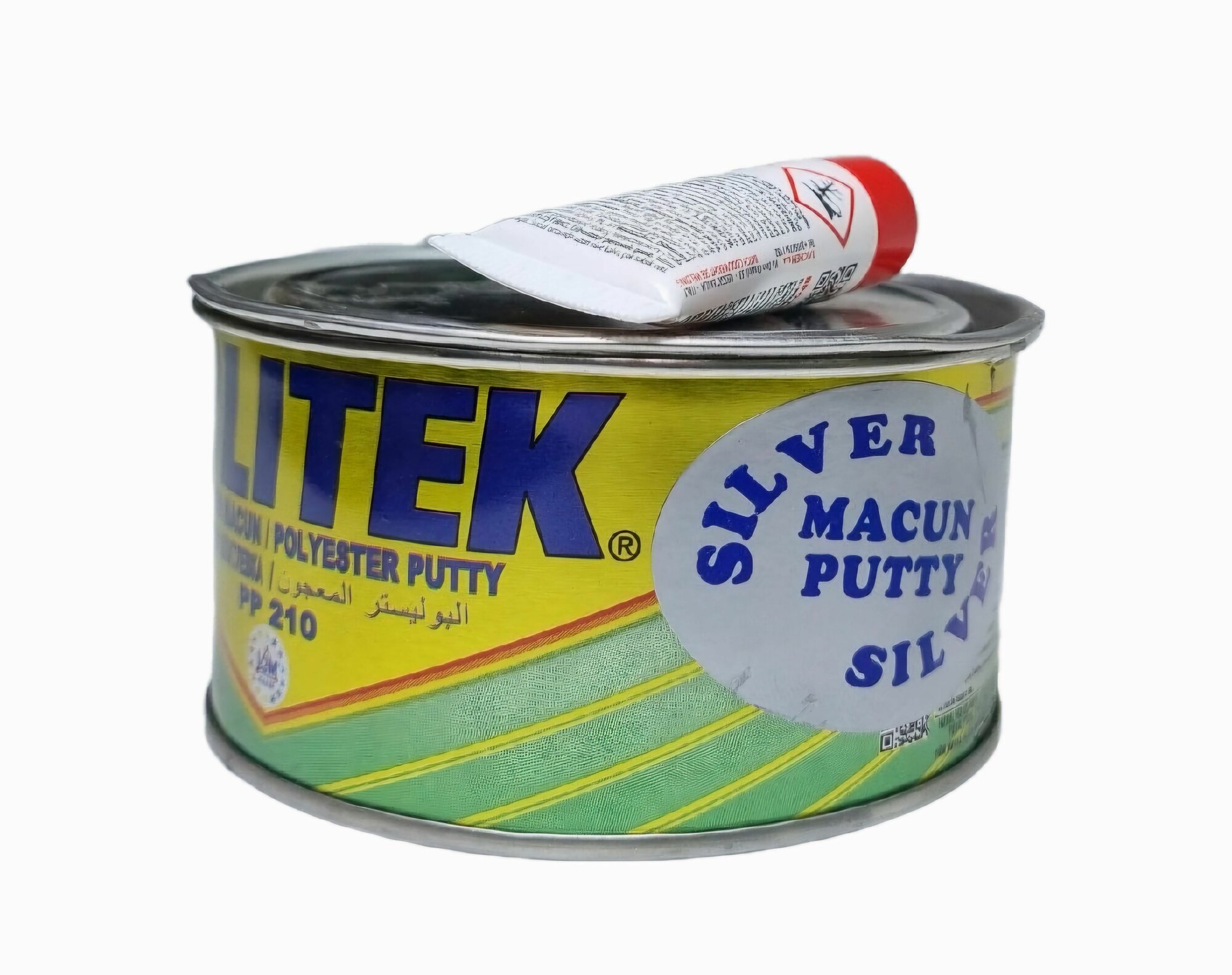 Купить Автошпатлевка Politek (Политек) с алюминием РР-210 silver macun putty, серебристая 400 гр с отвердителем, автомобильная шпаклевка 0,4 + отвердитель