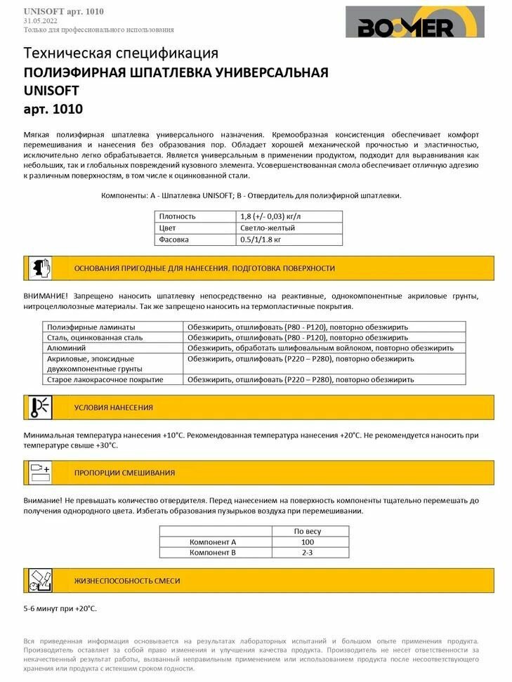 | Комплектация | Шпатлёвка BOOMER 1010 UNUSOFT полиэфирная универсальная 1кг + 20г отвердитель |