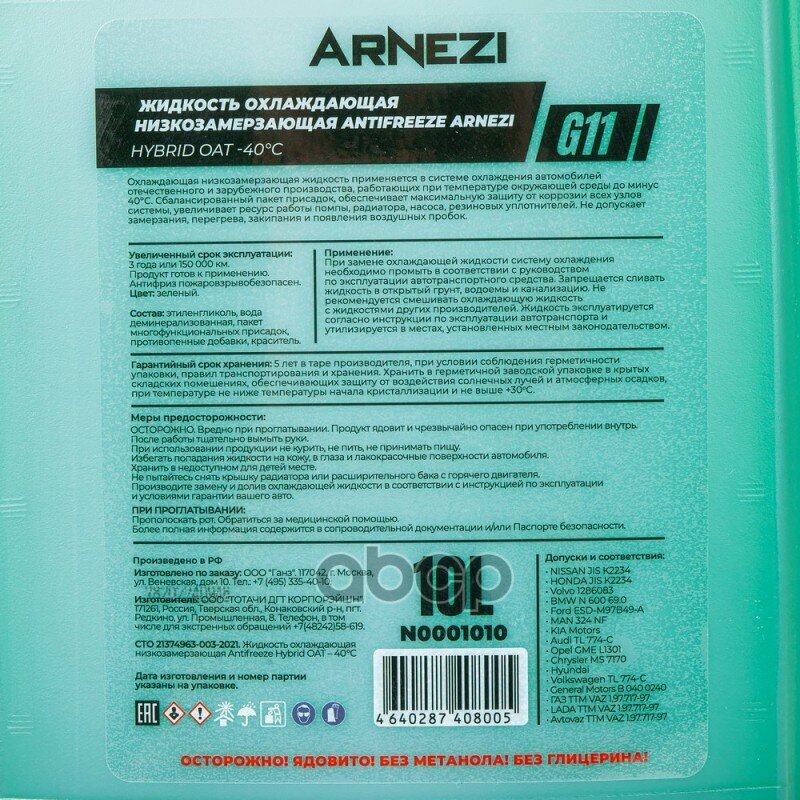 Антифриз ARNEZI Green G11 готовый -40 зеленый 10 л N0001010 ARNEZI арт. N0001010 интересное: