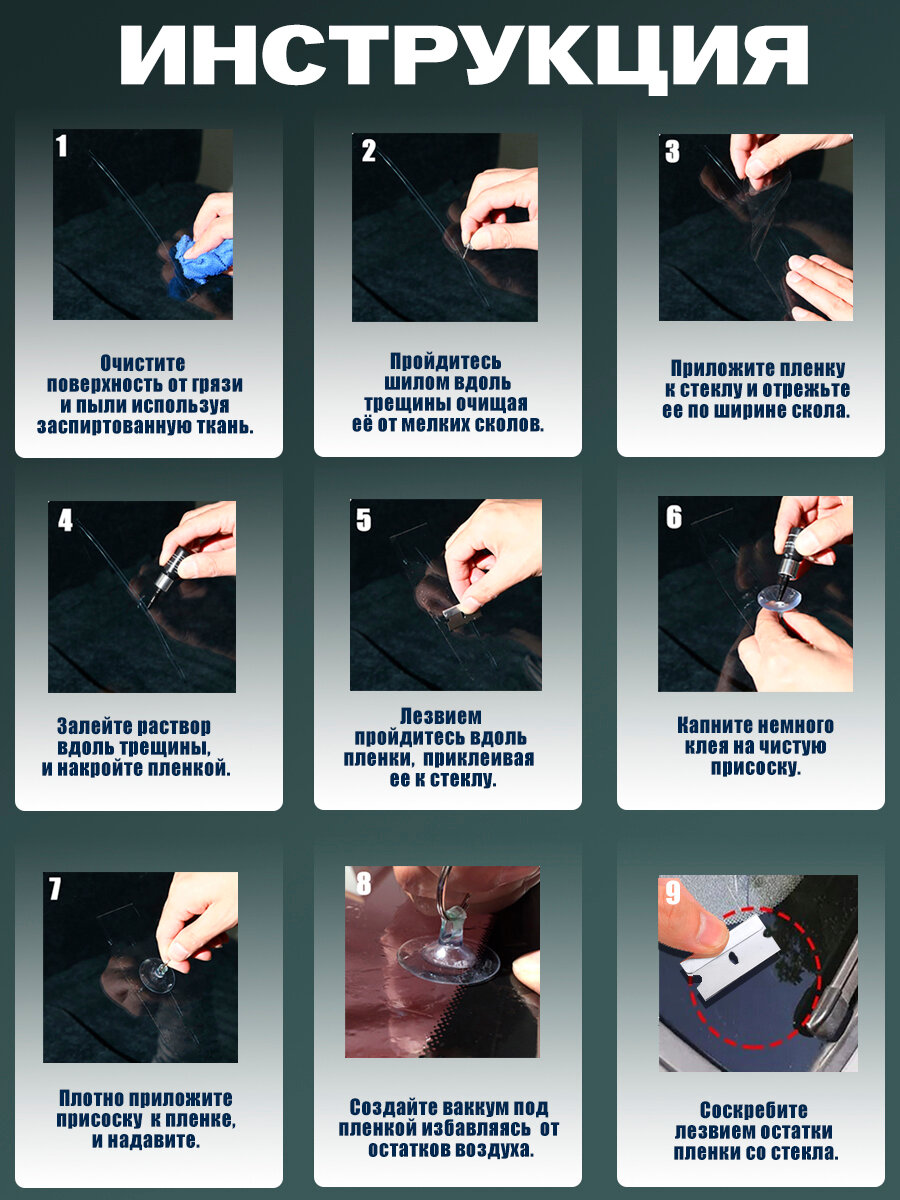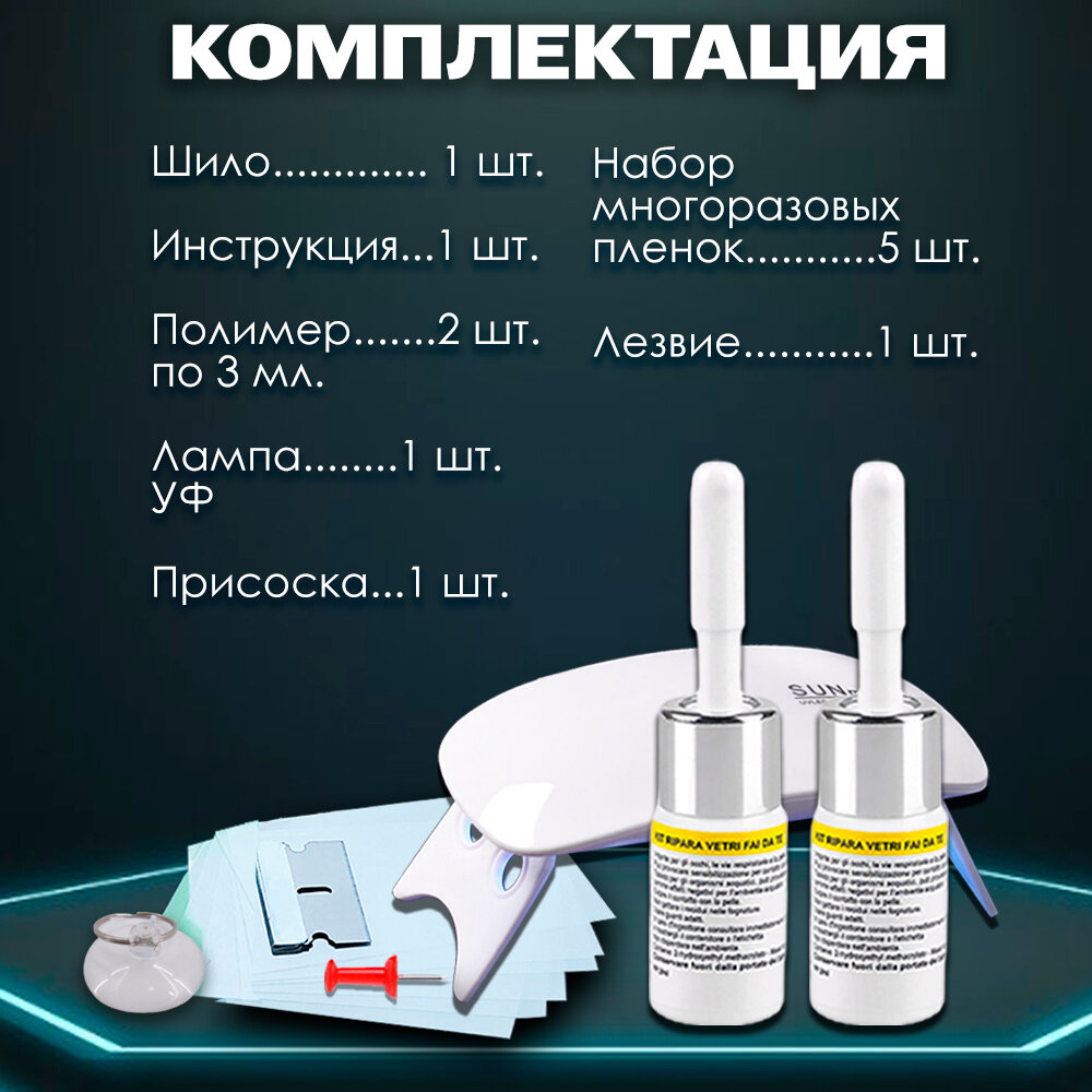 Комплект для ремонта сколов и трещин лобового стекла автомобиля интересное: