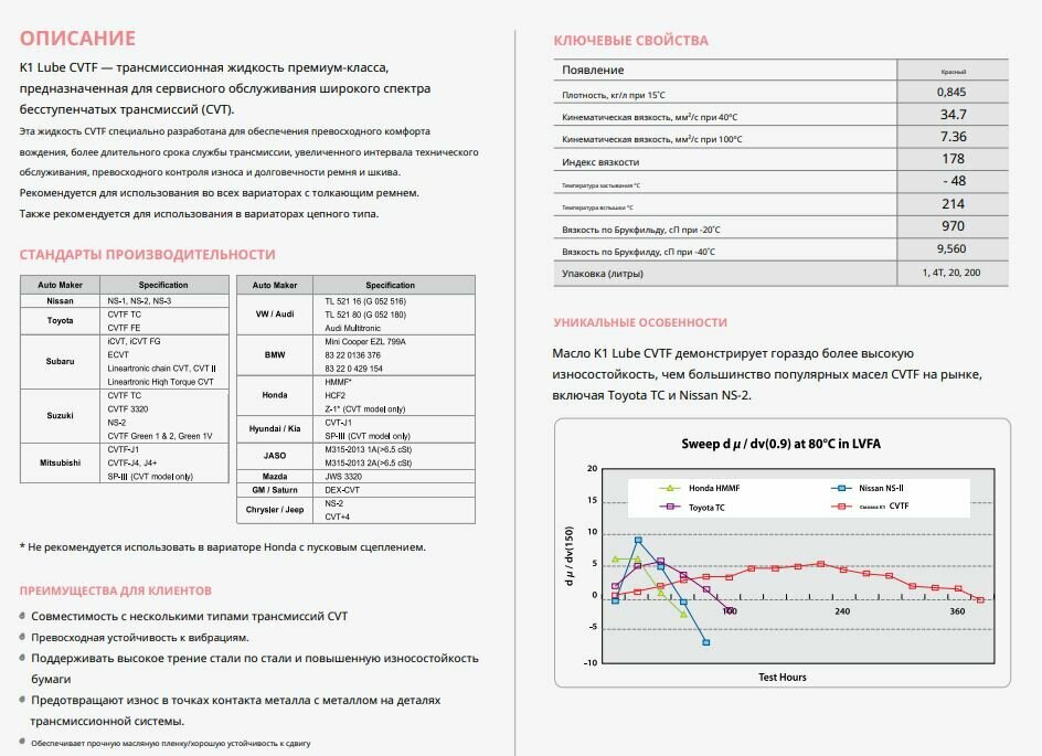 | Дополнительная информация | Выбирая масло трансмиссионное K1 Lube CVTF, вы получаете продукт высокого качества, который обеспечит надежную защиту и долговечность вашей трансмиссии. Рекомендуется использовать там, где требуются следующие характеристики: |