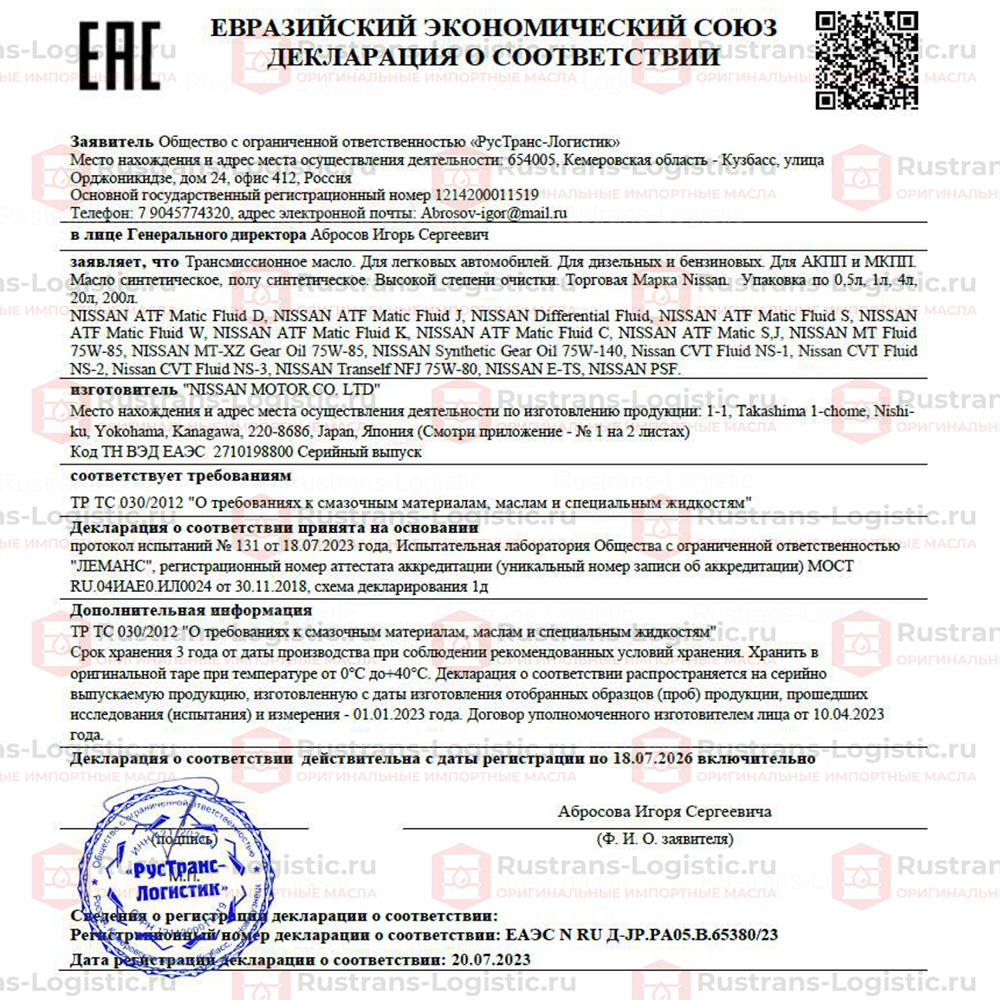 Масло трансмиссионное Nissan CVTF NS-3 (Япония), (4л) + лейка, жидкость синтетика для легкового и грузового транспорта с вариатором Ниссан KLE5300004, РТЛ