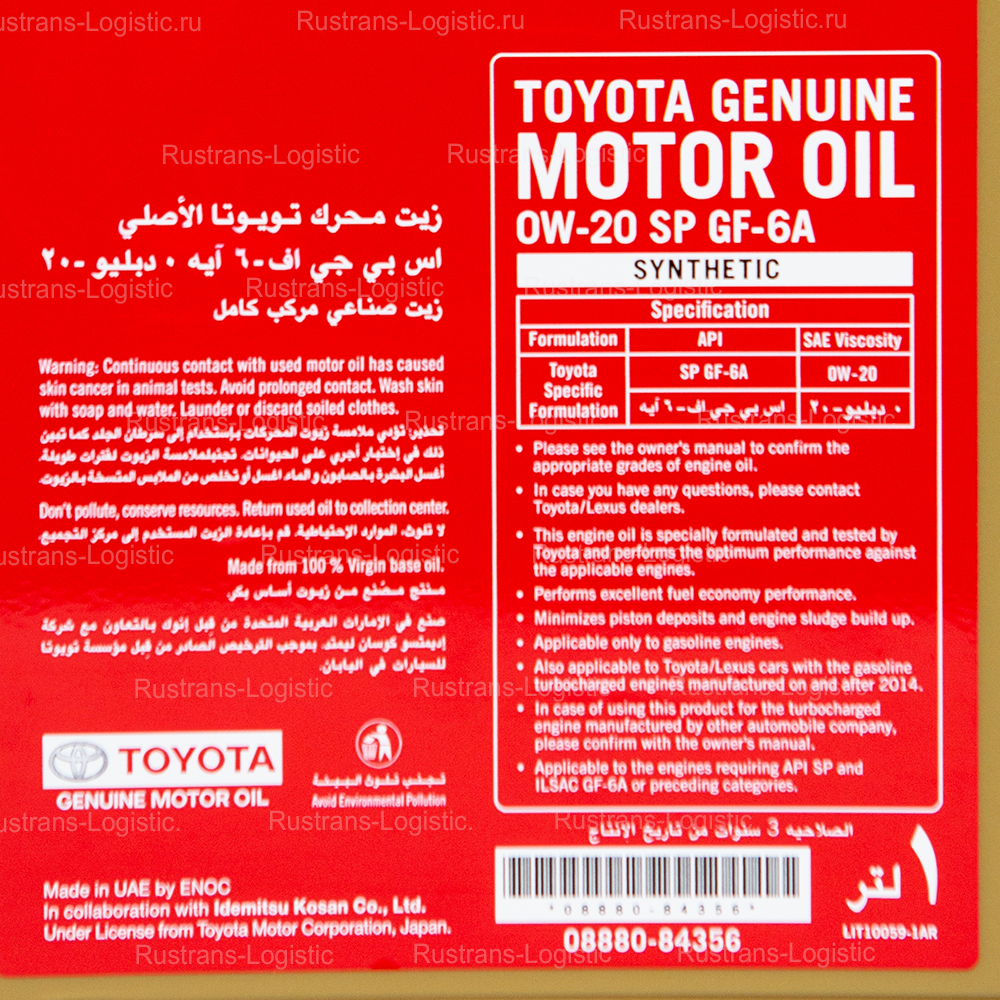 Моторное масло Toyota SP 0W-20 / ILSAC GF-6A (Дубай), (1л), масло для автомобиля с бенз. двигателем, 0w20 Тойота 08880-84356, РТЛ