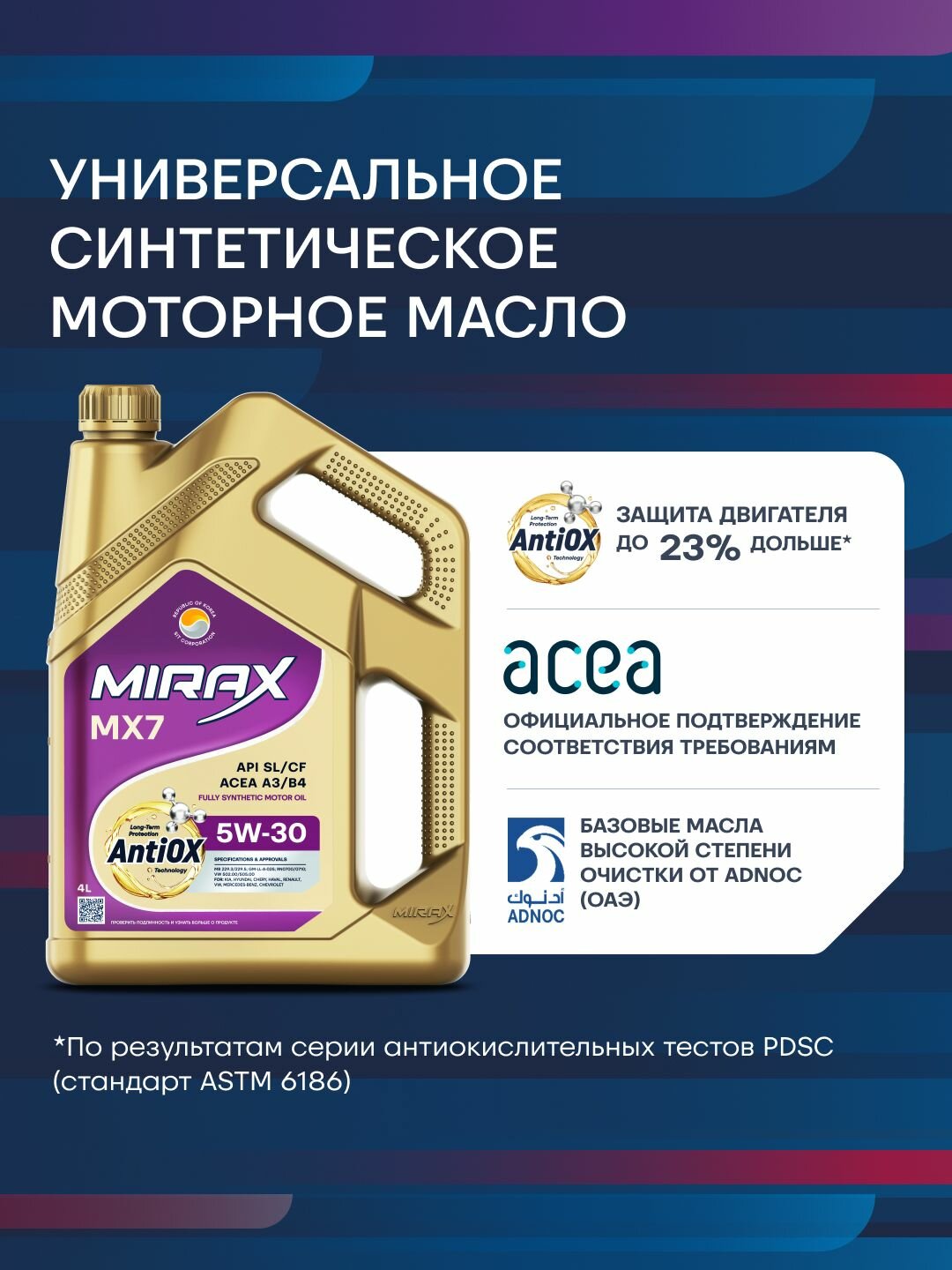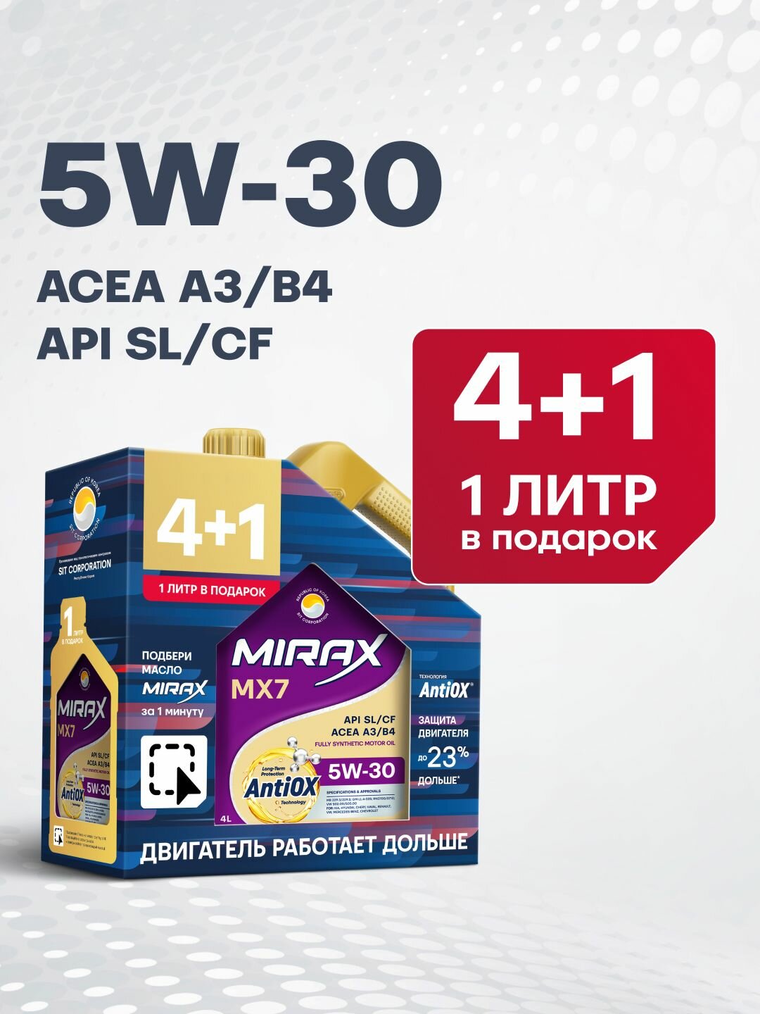 Купить Акция 4+1 Моторное масло MIRAX MX7 SAE 5W-30, API SL/CF, ACEA A3/B4 Синтетическое 5 л