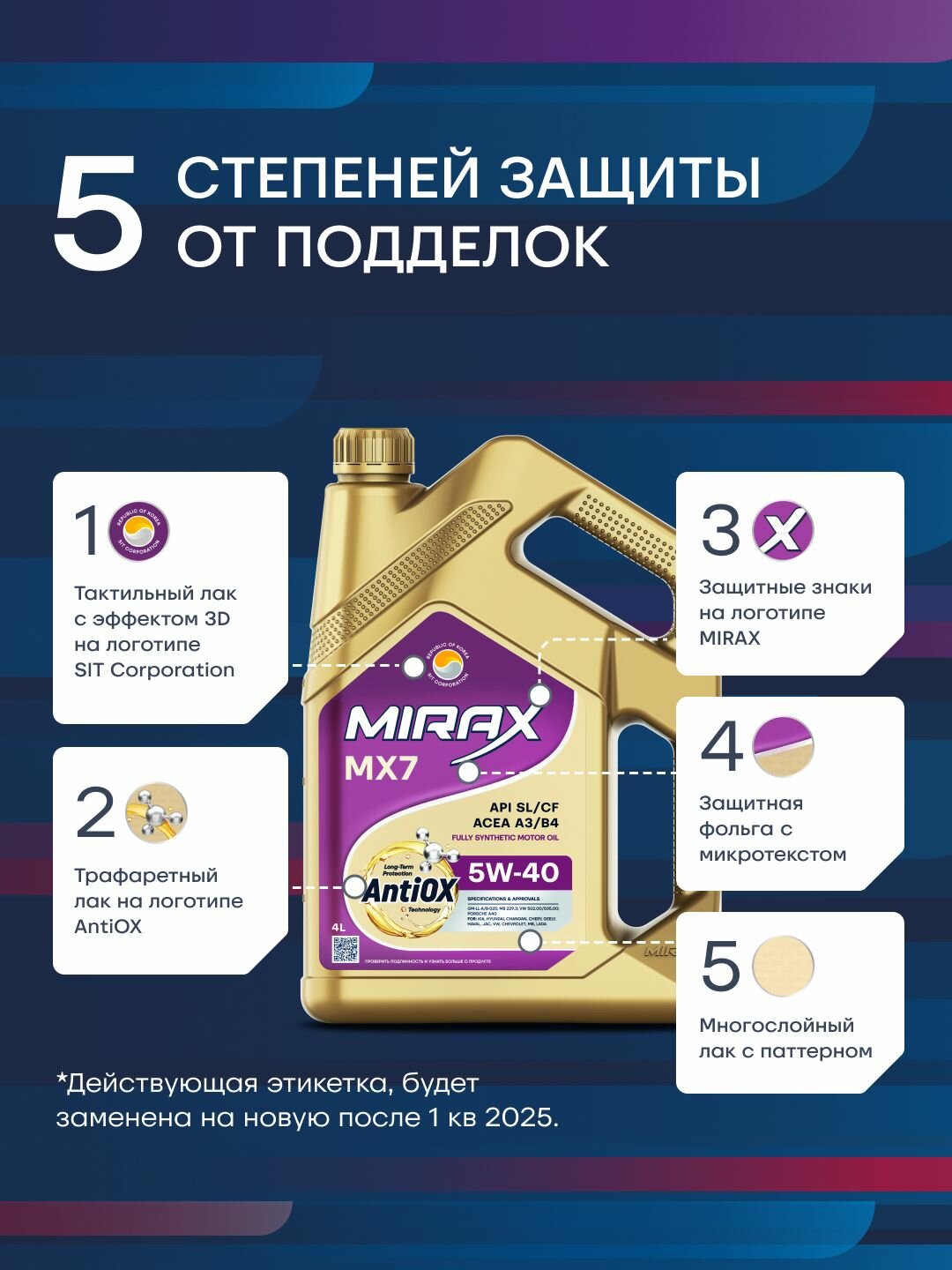 Акция 4+1 Моторное масло MIRAX MX7 SAE 5W-40, API SL/CF, ACEA A3/B4 Синтетическое 5 л интересное: