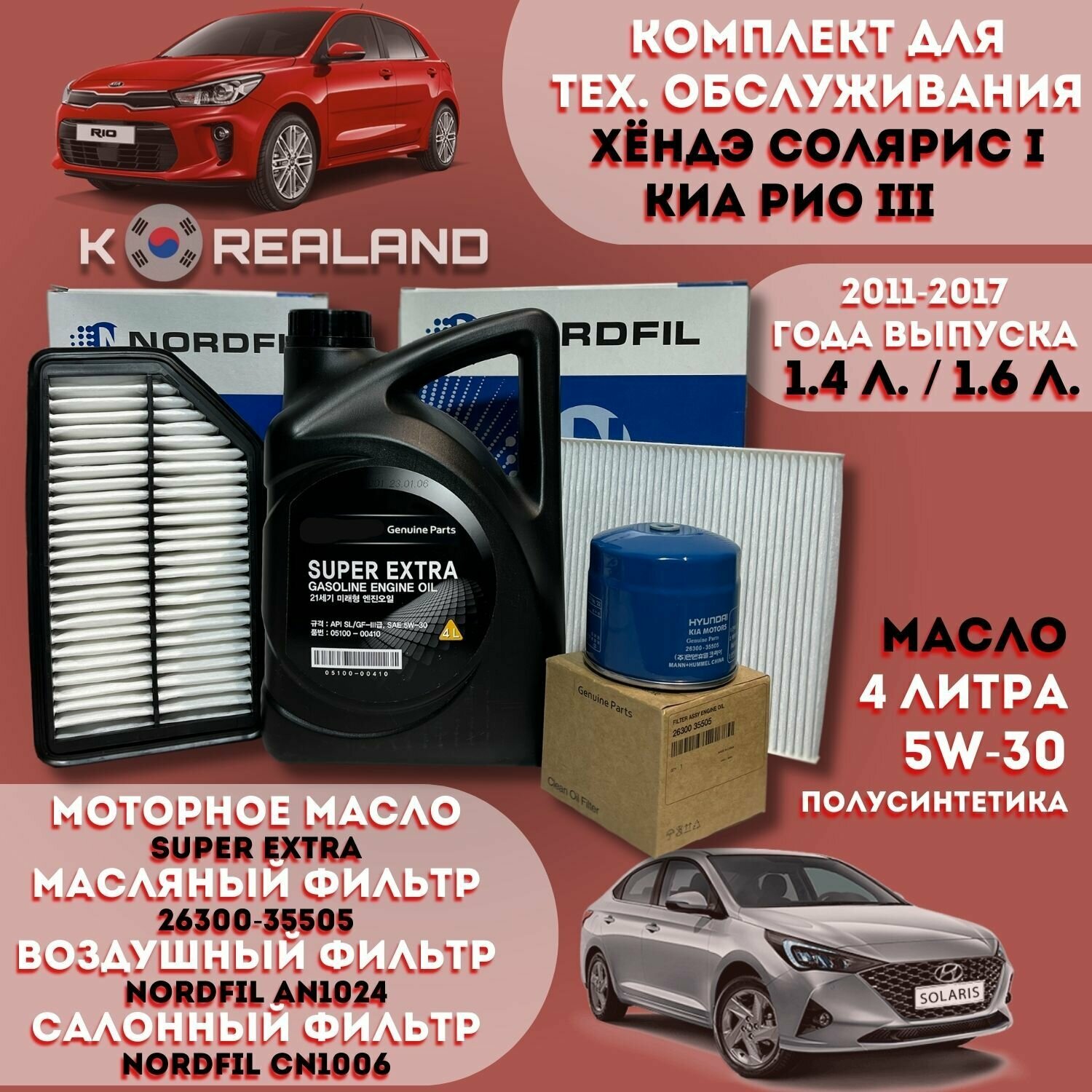 Купить Моторное масло Super Extra + фильтры для автомобиля Хендэ Солярис и Киа Рио 2011-2017 года выпуска с двигателем объёмом 1,4 и 1,6 литра