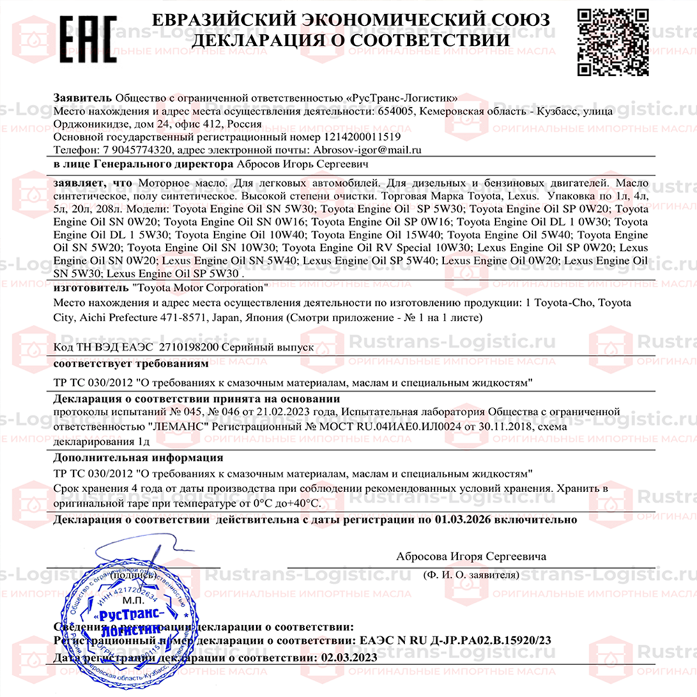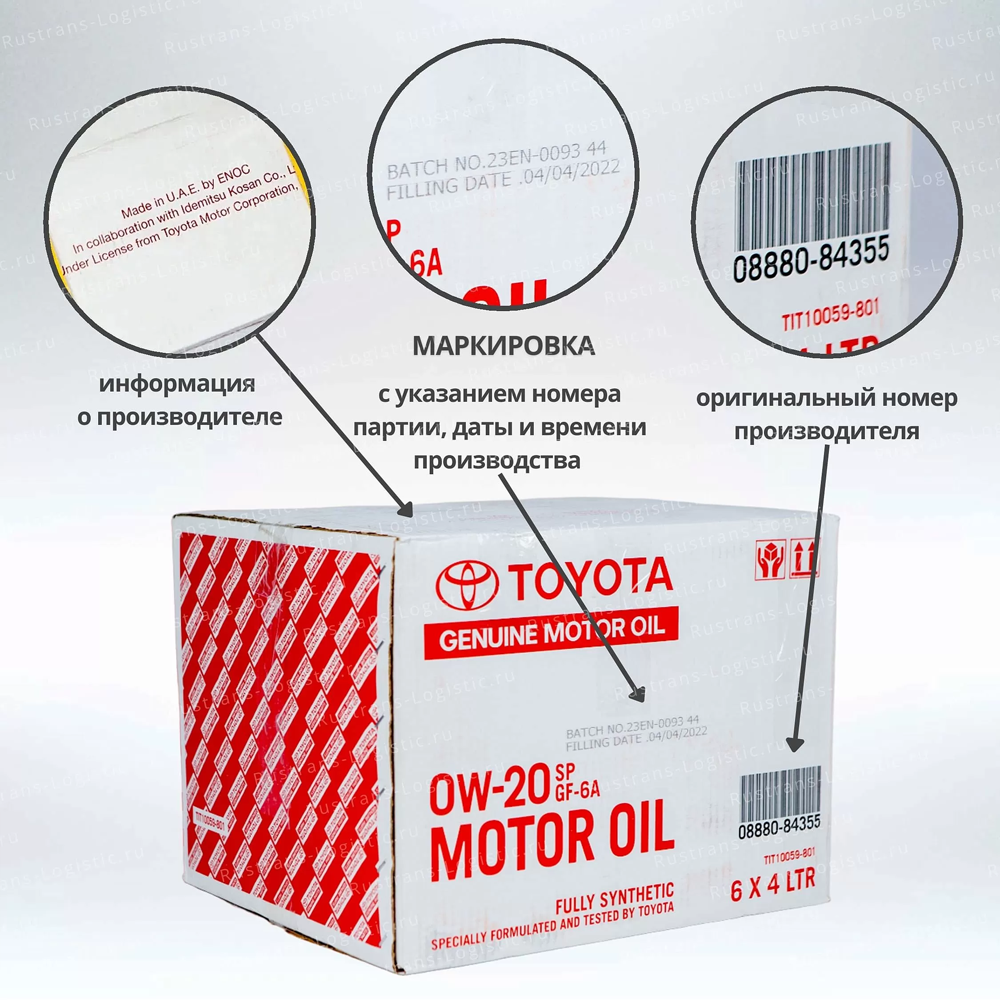 Моторное масло (универсальное) Toyota Oil SP 0W-20 (Дубай), (4л) + бирка, масло 0w20 для автомобиля синтетика Тойота 08880-84355, РТЛ