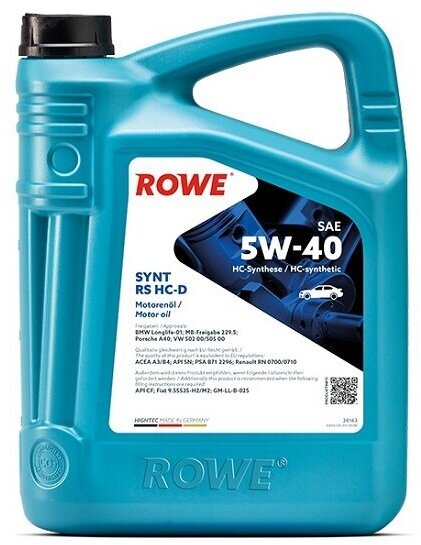 Ниже Вы можете прочитать отзывы на Моторное масло синтетическое ROWE Hightec Synt RS SAE 5W-40 HC-D, 5 литров канистра, ознакомится с подробными характеристиками, посмотреть интересные обзоры и фотографии на Моторное масло синтетическое ROWE Hightec Synt RS SAE 5W-40 HC-D, 5 литров канистра.