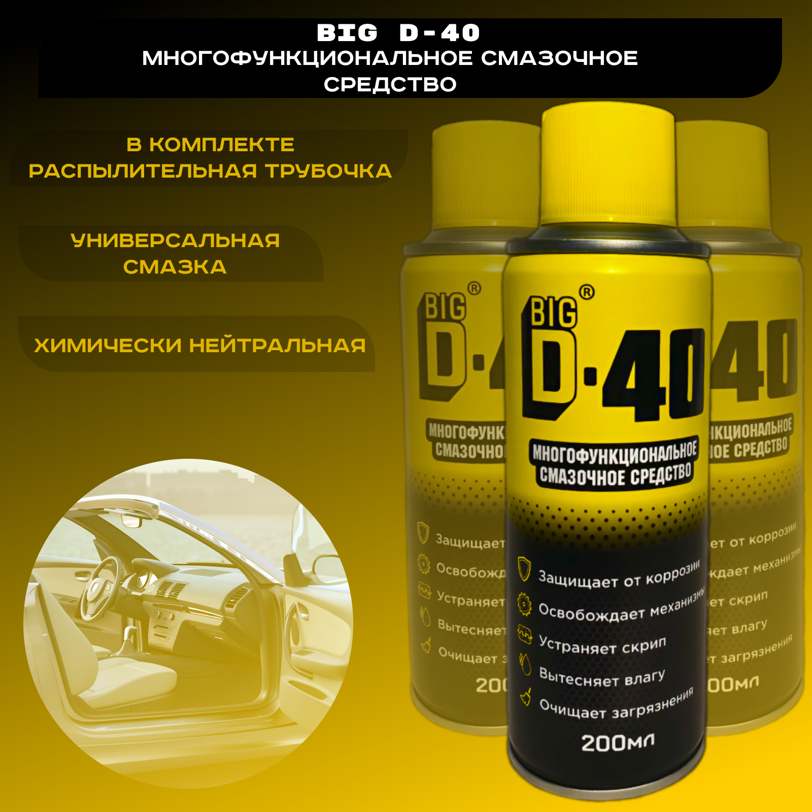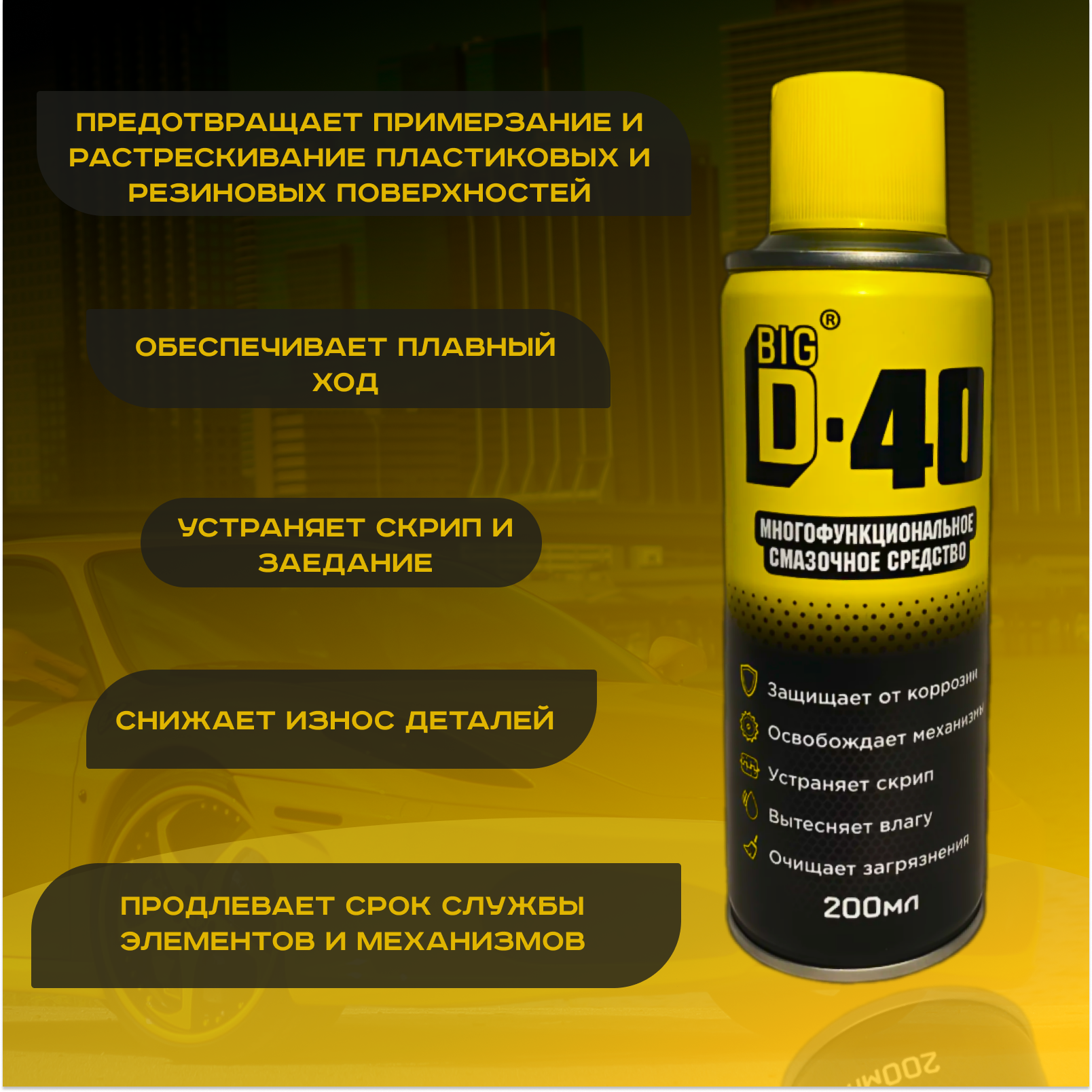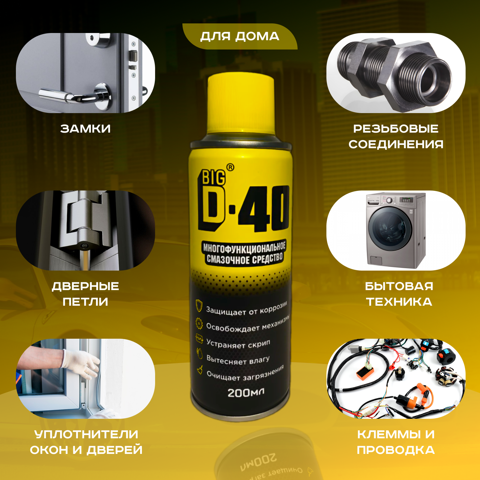 BIG D40 - Многофункциональное Смазочное Средство применяется в уходе за автомобилем, в быту, на даче, на производствах. интересное: