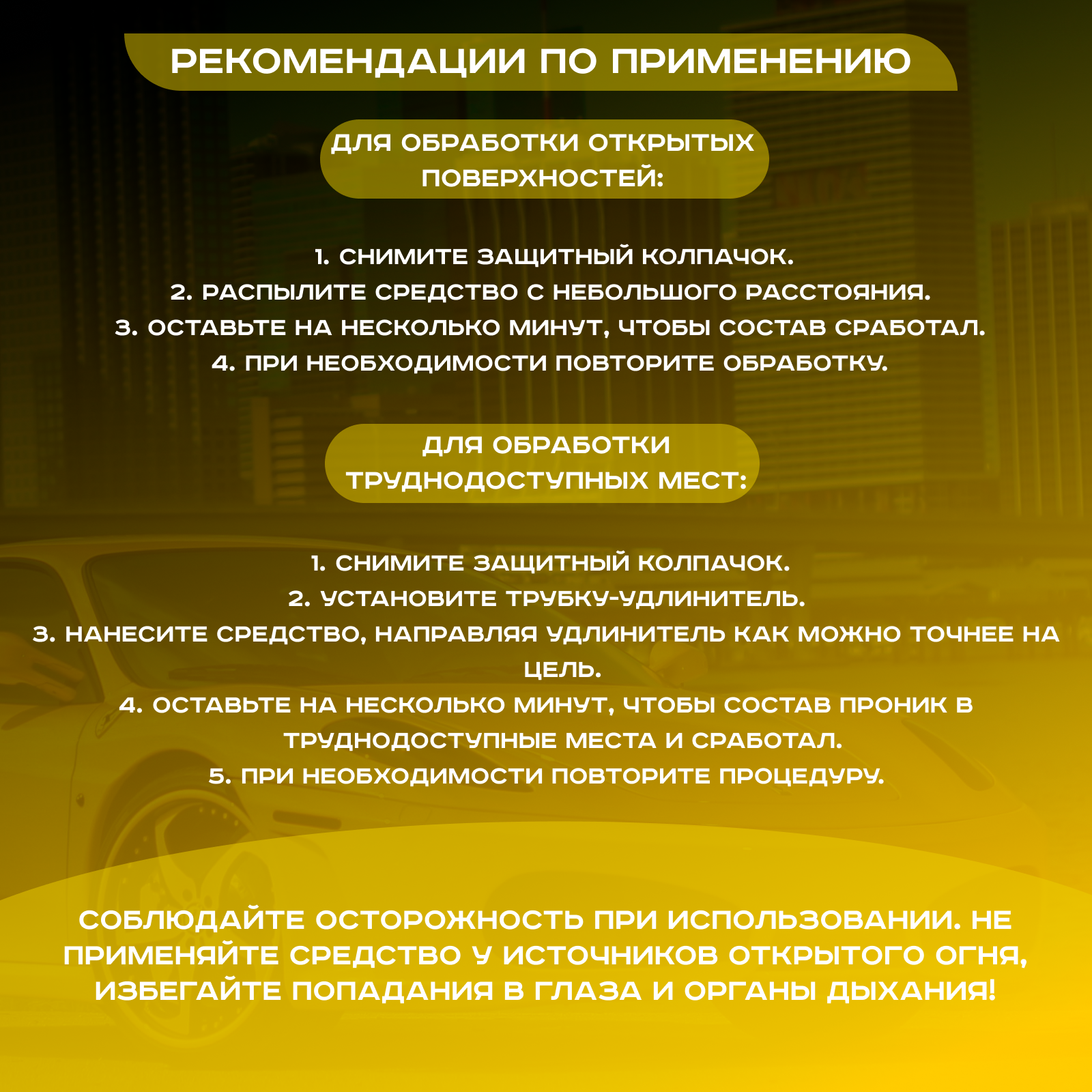 | Способ применения | Нанесите с небольшого расстояния на обрабатываемую поверхность. Оставить на несколько минут. При необходимости повторить обработку. |