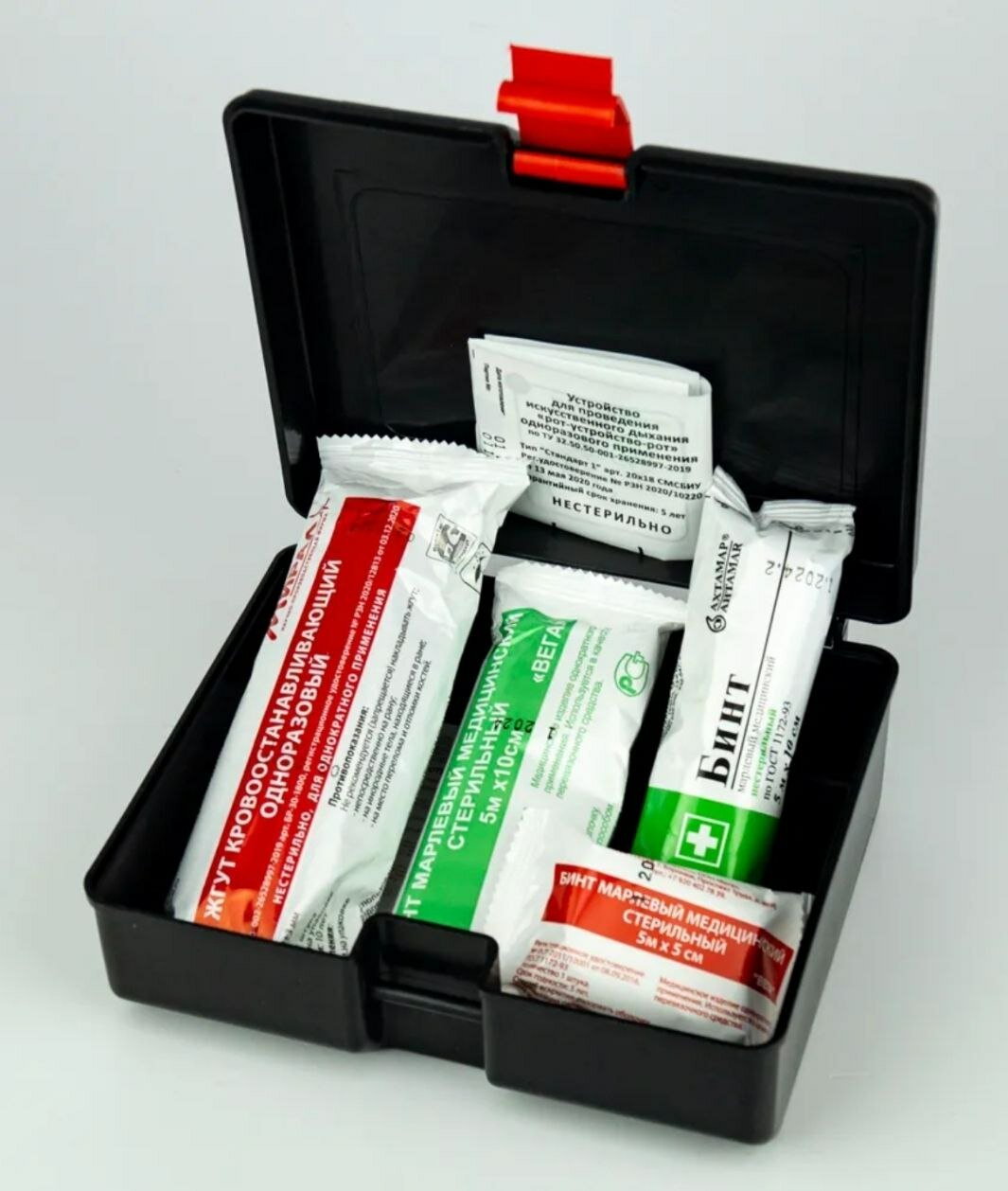 | Состав | Жгут - 1 шт, Бинт - 3 шт, Устройство для проведения искусственного дыхания - 1 шт, Маска - 1 шт. |