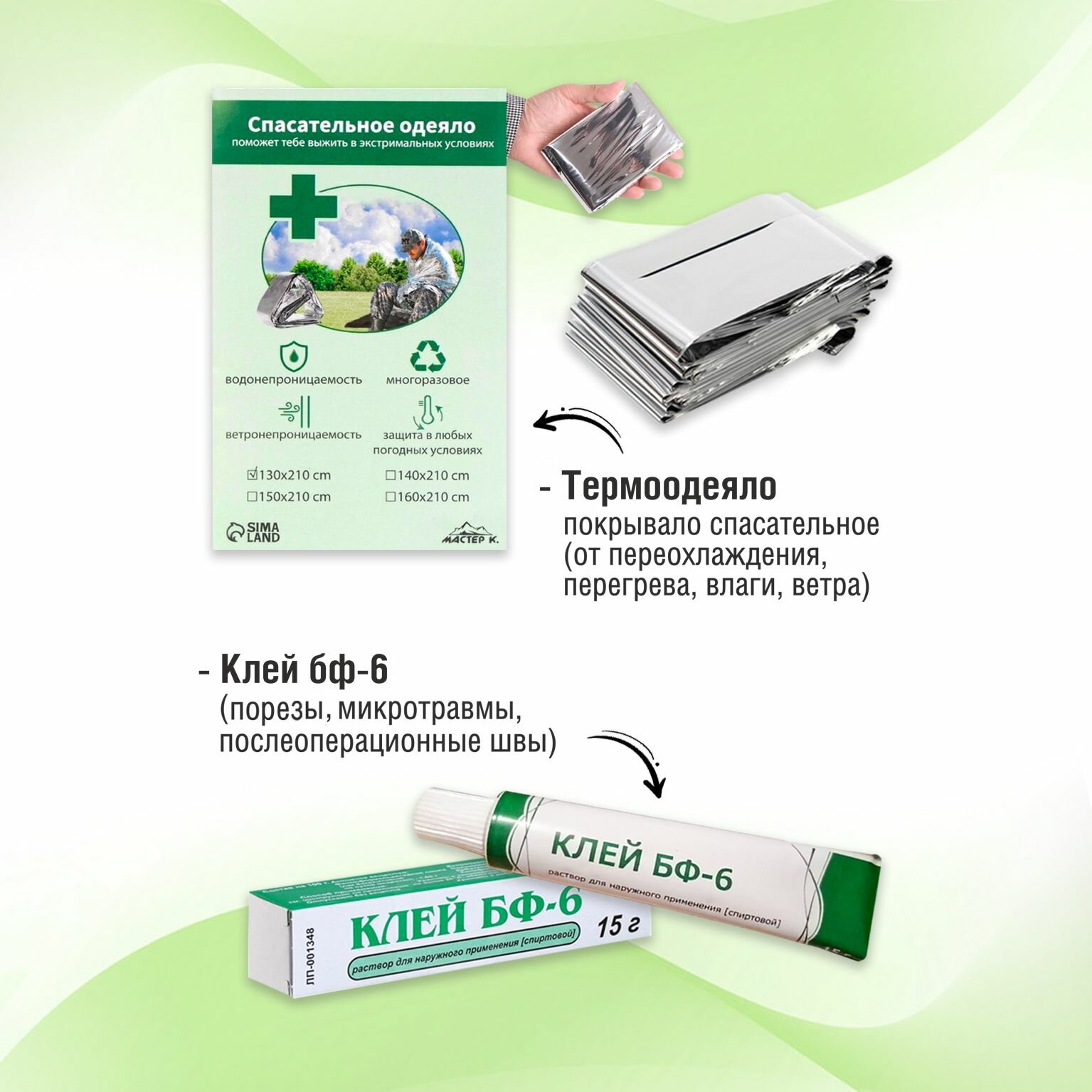 | Состав | 1- Сумки 2шт (Большая и vfktymrfz); 2- Турникет; 3- Бальзам "Заживин"; 4- Присыпка для ран; 5- Хлоргексидин с распылителем; 6- Зеленка; 7- Йод; 8- Пакет гипотермический; 9- Бинт Эластичный; 10- Бинт Самофиксирующийся; 11- Бинт Стерильный 7м х 14см; 12- Бинт Стерильный 5м х 14см; 13- Бинт Нестерильный 7м х 14см; 14- Бинт Нестерильный 5м х 14см; 15; Бинт Эластичный трубчатый; 16- Лейкопластырь рулонный; 17- Лейкопластырь Бактериальный 2шт; 18- Лейкопластырь "Унипласт" Бактериальный водостойкий - 8 шт; 19- Лейкопластырь Перцовый; 20- Салфетка кровоостанавливающая для ран; 21- Салфетка Спиртовая 5шт; 22- Салфетка с нашатырём; 23- Салфетки марлевые стерильные; 24- Термоодеяло; 25- Ножницы медицинские; 26- Пинцет; 27- Устройство-Маска для ИВЛ; 28- Маска четырёхслойная; 29- Перчатки Нитриловые; 30- Бахилы; 31- Ватные диски - 5шт; 32- Ватные Палочки 10шт; 33- Шприц 2 мл; 34-Шприц 5 мл; 35- Булавка Английская; 36- Шоколадные таблетки в Подарок; 37 - Клей БФ 6. Новый состав по гост сентябрь 2024 |
