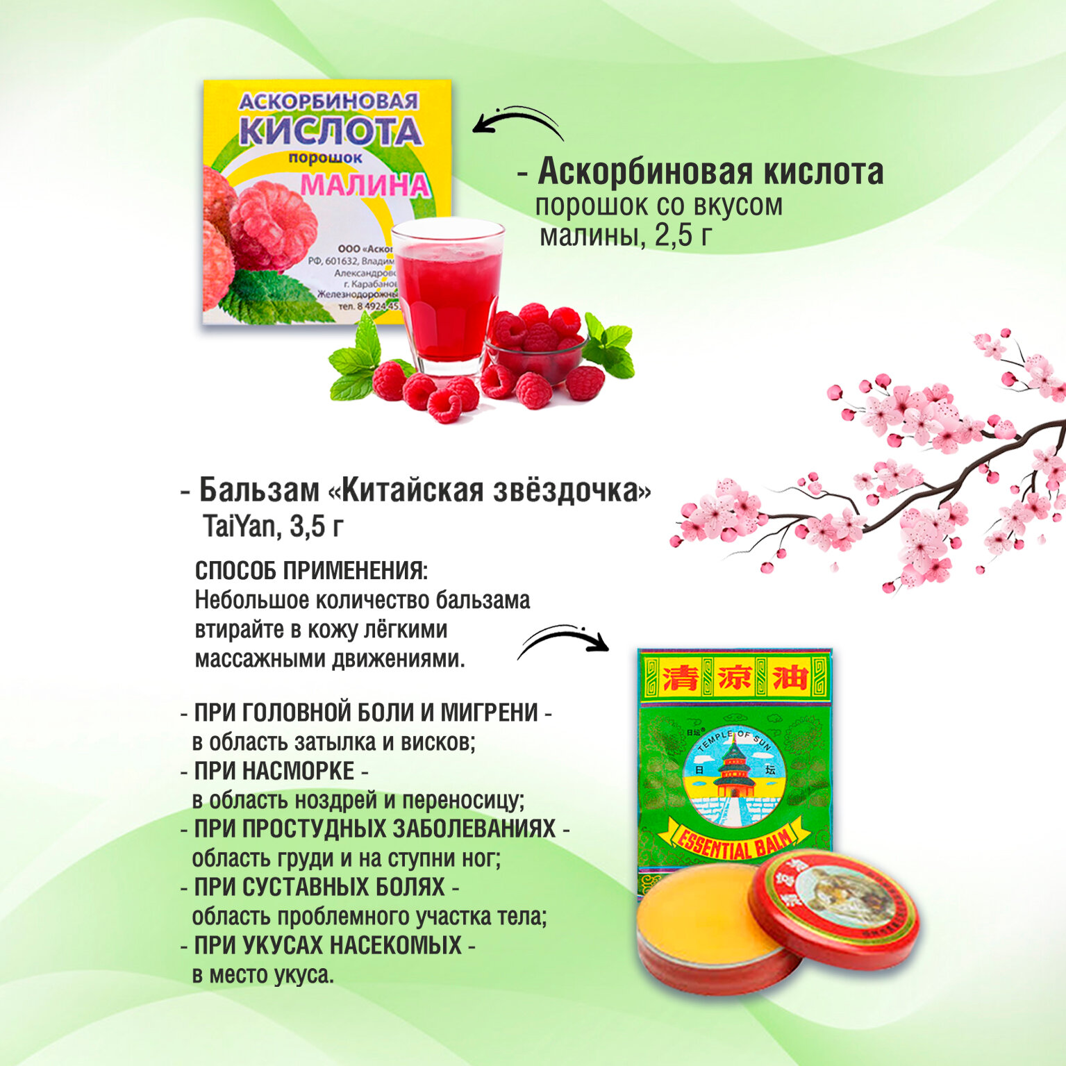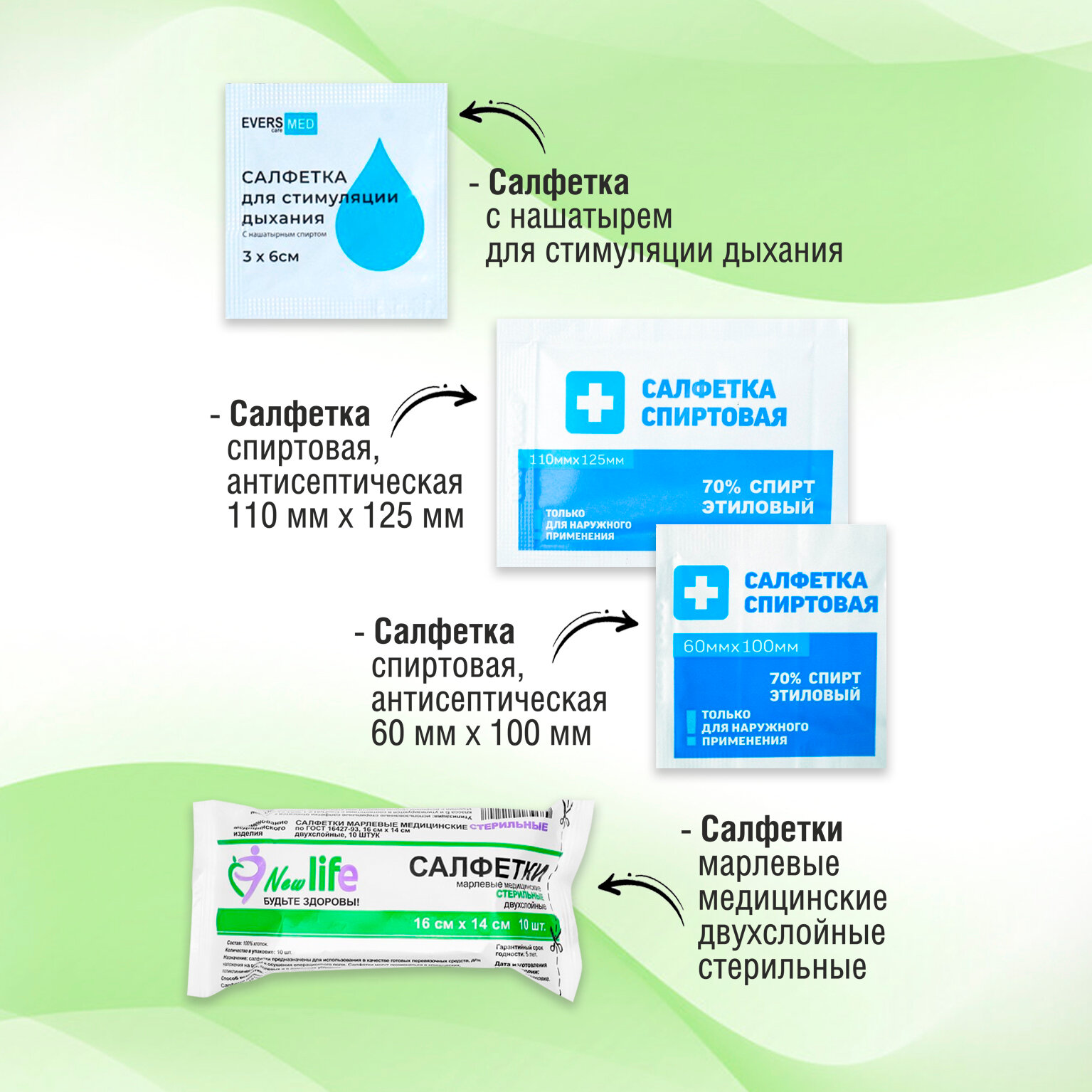 | Состав | 1- Сумки 2шт (Большая и мини); 2- Турникет; 3- Бальзам "Заживин"; 4- Присыпка для ран; 5- Хлоргексидин с распылителем; 6- Зеленка; 7- Йод; 8- Пакет гипотермический; 9- Бинт Эластичный; 10- Бинт Самофиксирующийся; 11- Бинт Стерильный 7м х 14см; 12- Бинт Стерильный 5м х 14см; 13- Бинт Нестерильный 7м х 14см; 14- Бинт Нестерильный 5м х 14см; 15; Бинт Эластичный трубчатый; 16- Лейкопластырь рулонный; 17- Лейкопластырь Бактериальный 2шт; 18- Лейкопластырь "Унипласт" Бактериальный водостойкий - 8 шт; 19- Лейкопластырь Перцовый; 20- Салфетка кровоостанавливающая; 21- Салфетка Спиртовая 5шт; 22- Салфетка с нашатырём; 23- Салфетки марлевые стерильные; 24- Термоодеяло; 25- Ножницы медицинские; 26- Пинцет; 27- Устройство-Маска для ИВЛ; 28- Маска четырёхслойная; 29- Перчатки Нетриловые; 30- Бахилы; 31- Ватные диски - 5шт; 32- Ватные Палочки 10шт; 33- Шприц Медицинский 2 мл; 34-Шприц Медицинский 5 мл; 35- Булавка Английская; 36- Шоколадные таблетки в Подарок; 37 - Клей БФ 6. |
