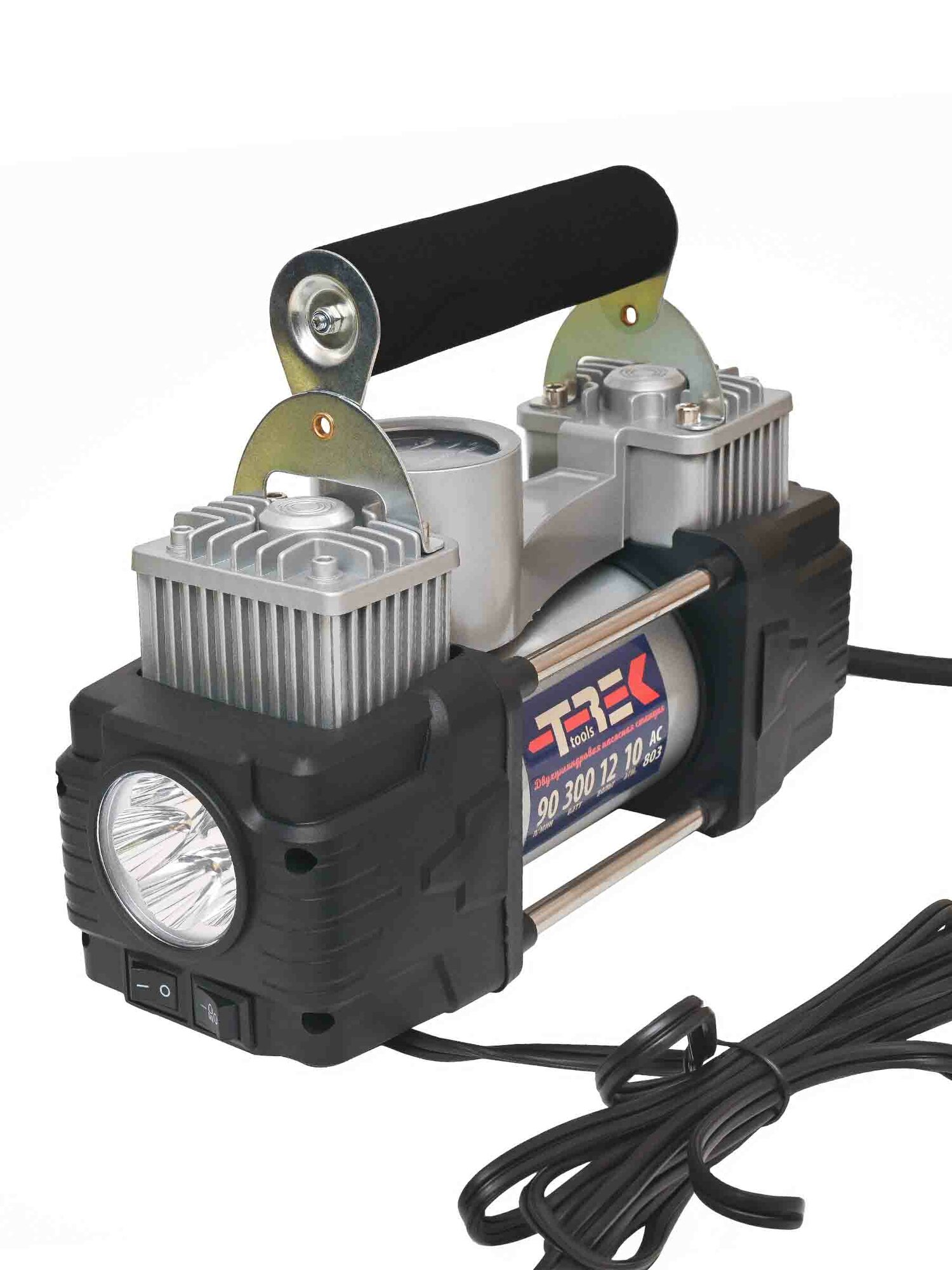 Компрессор автомобильный двухпоршневой 90л/мин с ФОНАРЁМ в сумке TREK, 803 интересное: