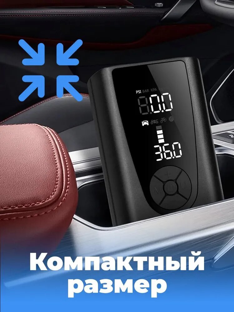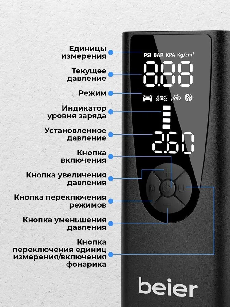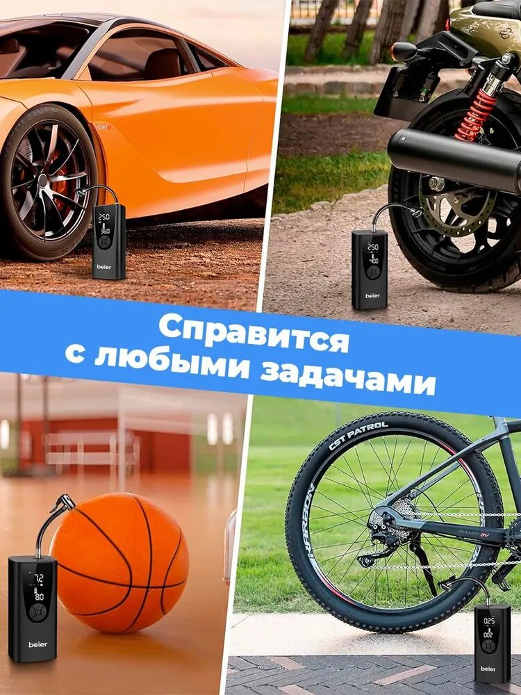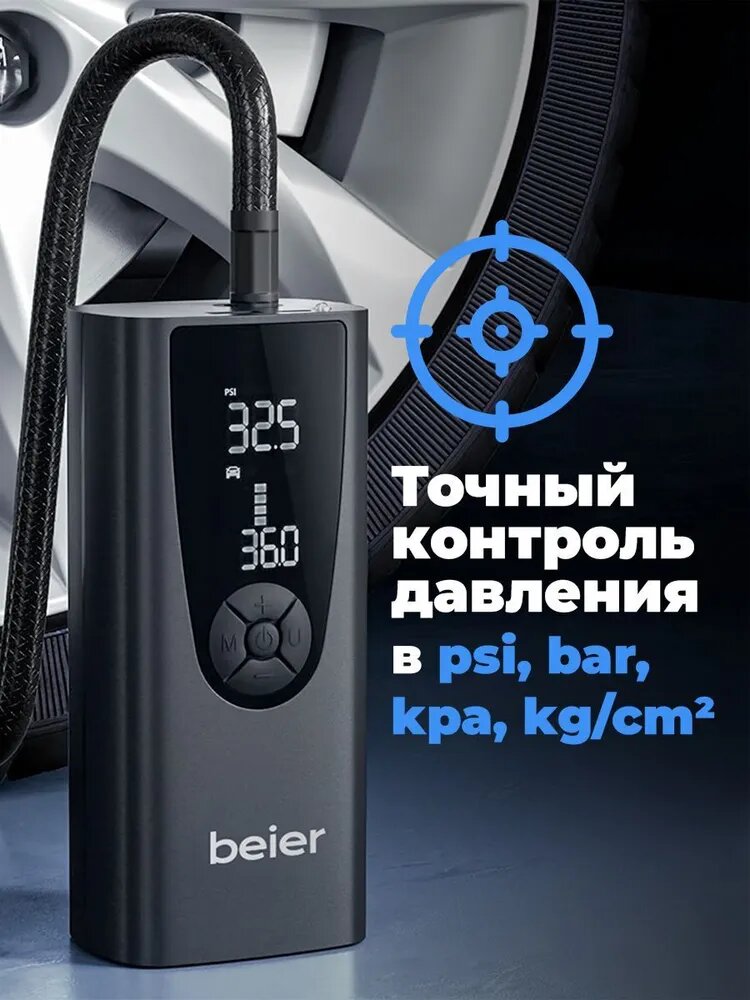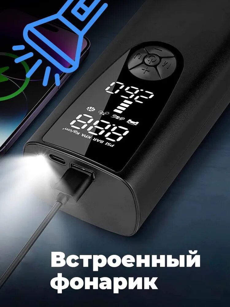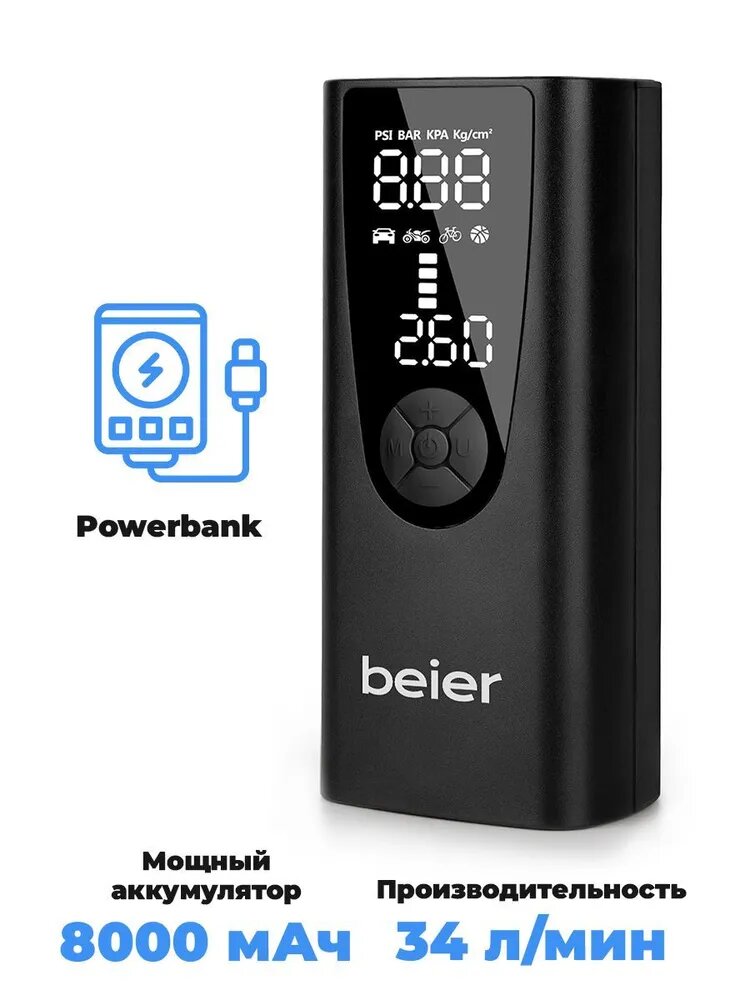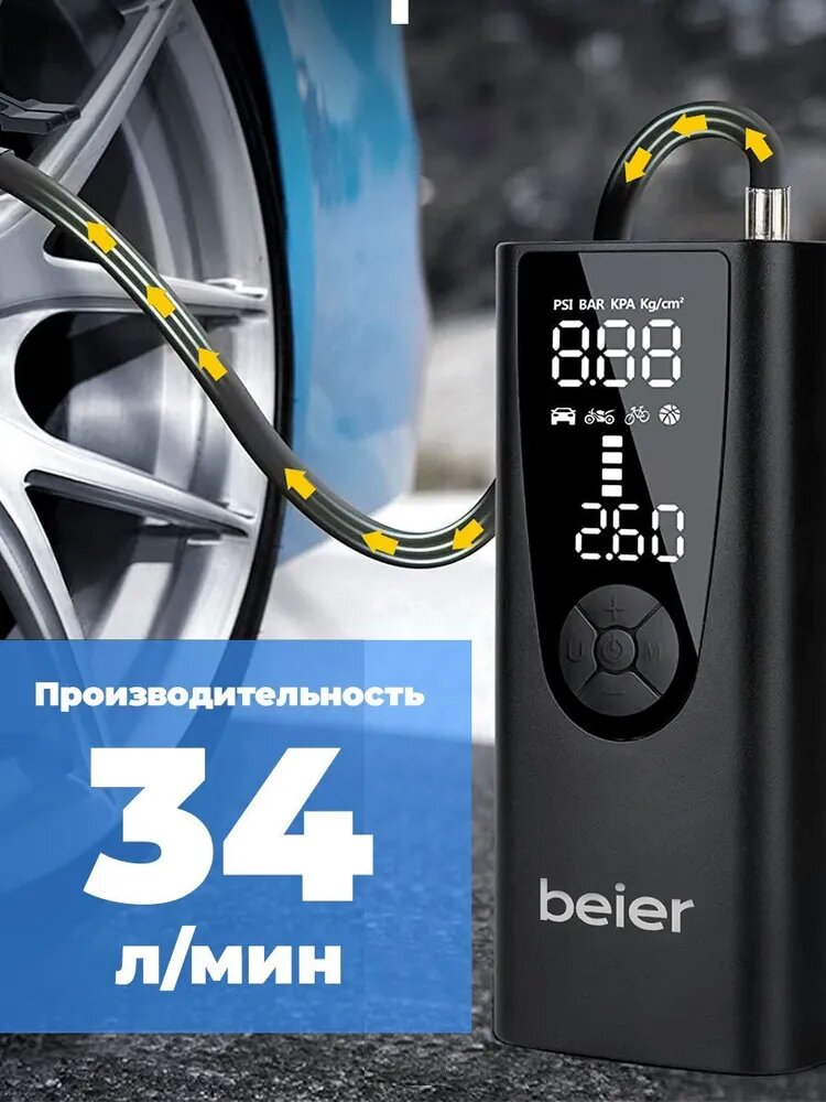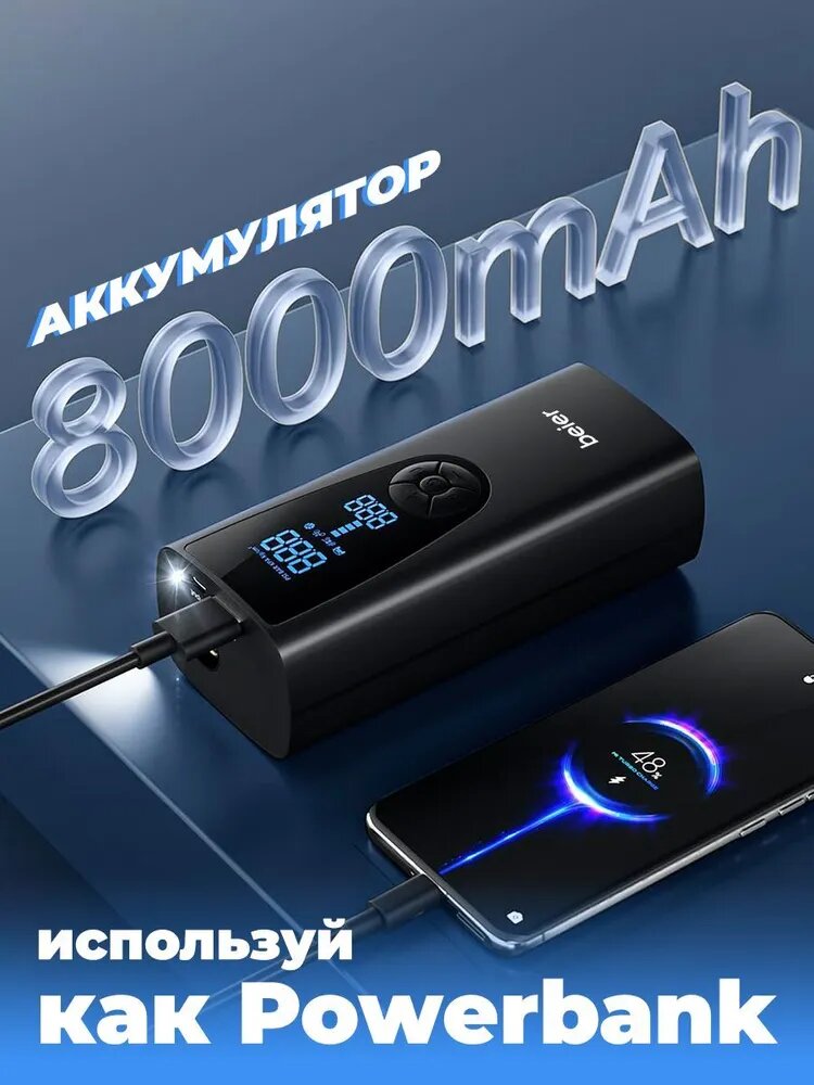 Автомобильный компрессор для накачки шин, насос беспроводной для мотоциклов, машин, камер мячей, электронасос для надувной кровати, автонасос с фонариком 34 л/мин, Powerbank 8000 BEIER Windstrke H-150 интересное:
